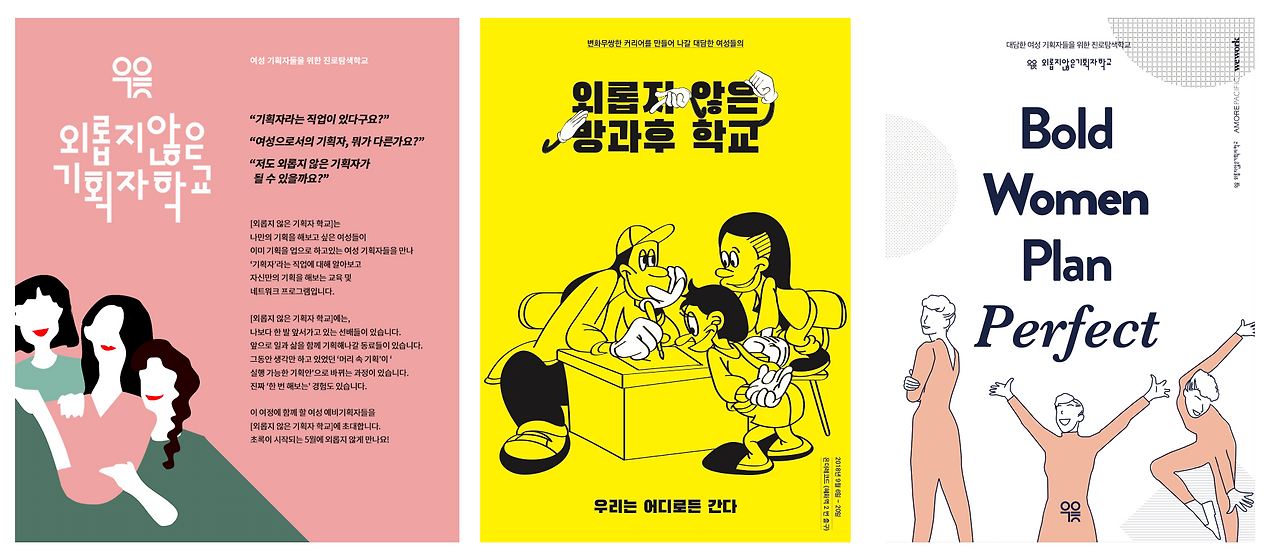 외롭지 않은 기획자학교는 이미 일가를 이룬 누군가의 이야기보다 지금 여기에서 자신만의 전문성을 쌓아나가며 일하고 있는 여성 실무자들의 이야기에 더욱 주목합니다. "사회 초년생 때 가장 필요했던 이야기는 누군가의 성공스토리가 아닌 나보다 5년 정도 먼저 고민하고 자기 길을 만든 여성들의 이야기"였다는 말이 외롭지 않은 기획자학교를 시작하게 했거든요. 올 한해 기획자학교는 열 네명의 여성들을 만났습니다. 열 명의 강사진 뿐만 아니라 네 명의 20대 기획자들을 만나기도 했어요. 고민을 풀어간 이야기도 중요하지만 고민을 안고 자기만의 해법을 만들어 가고 있는 일하는 20대들의 이야기에 주목하게 된 계기가 되기도 했습니다.