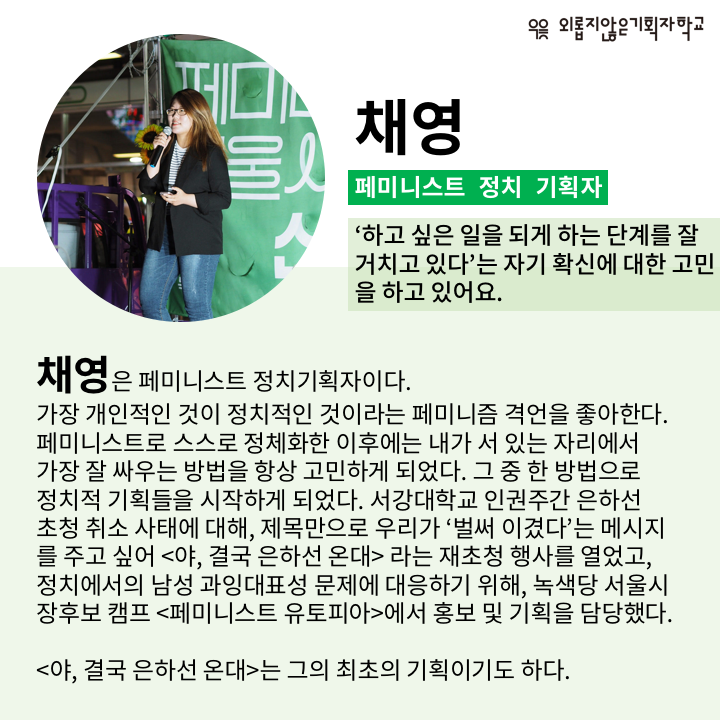 기획자학교's Point : 페미니스트 정치기획자라니, 멋지지 않나요! '나는 레퍼런스가 없지만 감이 있다'는 말은 이날 있었던 행사의 아하 모먼트가 되기도 했습니다. 앞서 간 여성들에게서 답을 찾는 대신, 지금 나의 감을 믿고 이 자리에서 필요한 무브먼트를 기획해가는 정치기획자의 행보가 궁금하신 분들은 채영님을 만나보세요!