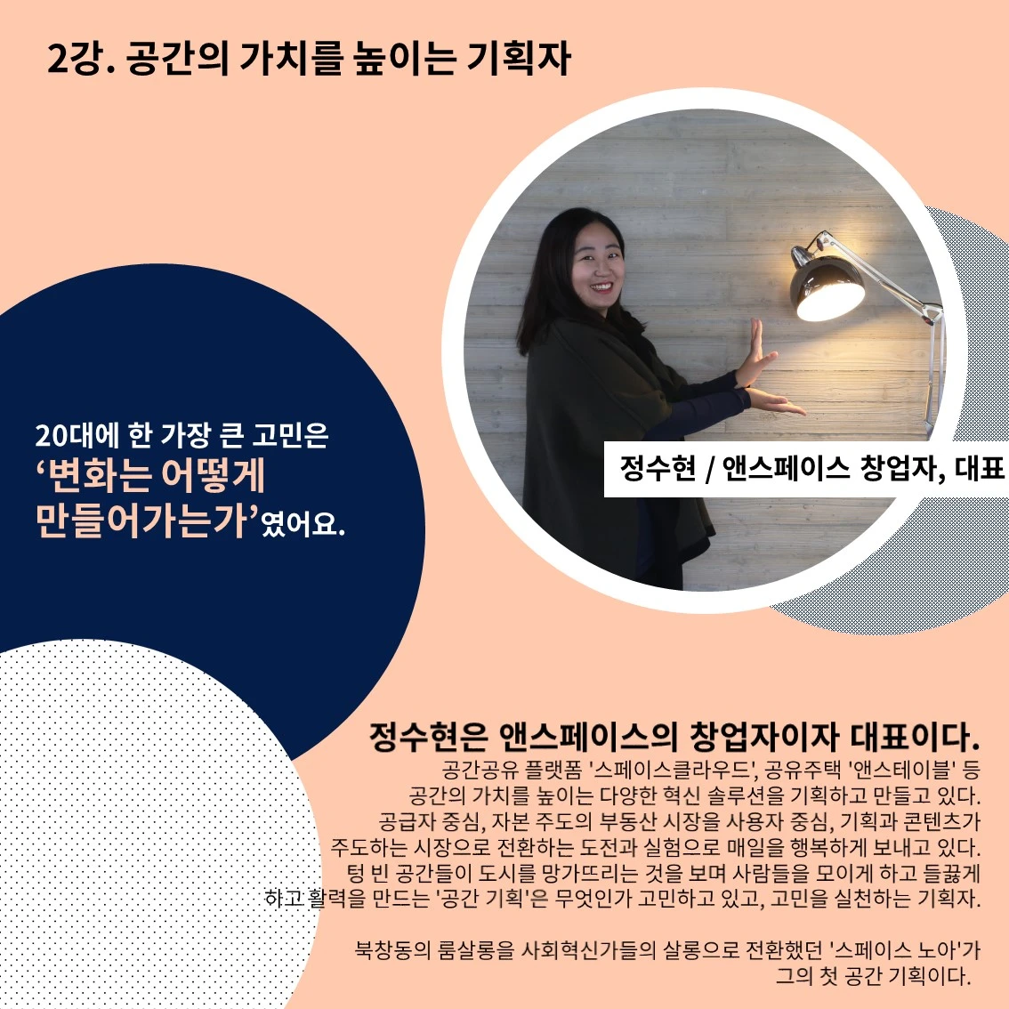 기획자학교's Point : 정수현님은 '외롭지 않은 방과후학교'와 '외롭지 않은 기획자학교' 3기에 모두 와주셨어요. 특유의 에너지로 수강생들에게 힘을 불어넣고, 마지막에는 자신의 기획을 사업화하여 자산으로 만들어보기를 당부하며 유유히 떠나가신 분! 앤스페이스가 펼치고 있는 다양한 사업 뿐만 아니라 큰 일 하는 기획자가 되고 싶으신 분들은 정수현님을 만나보세요!