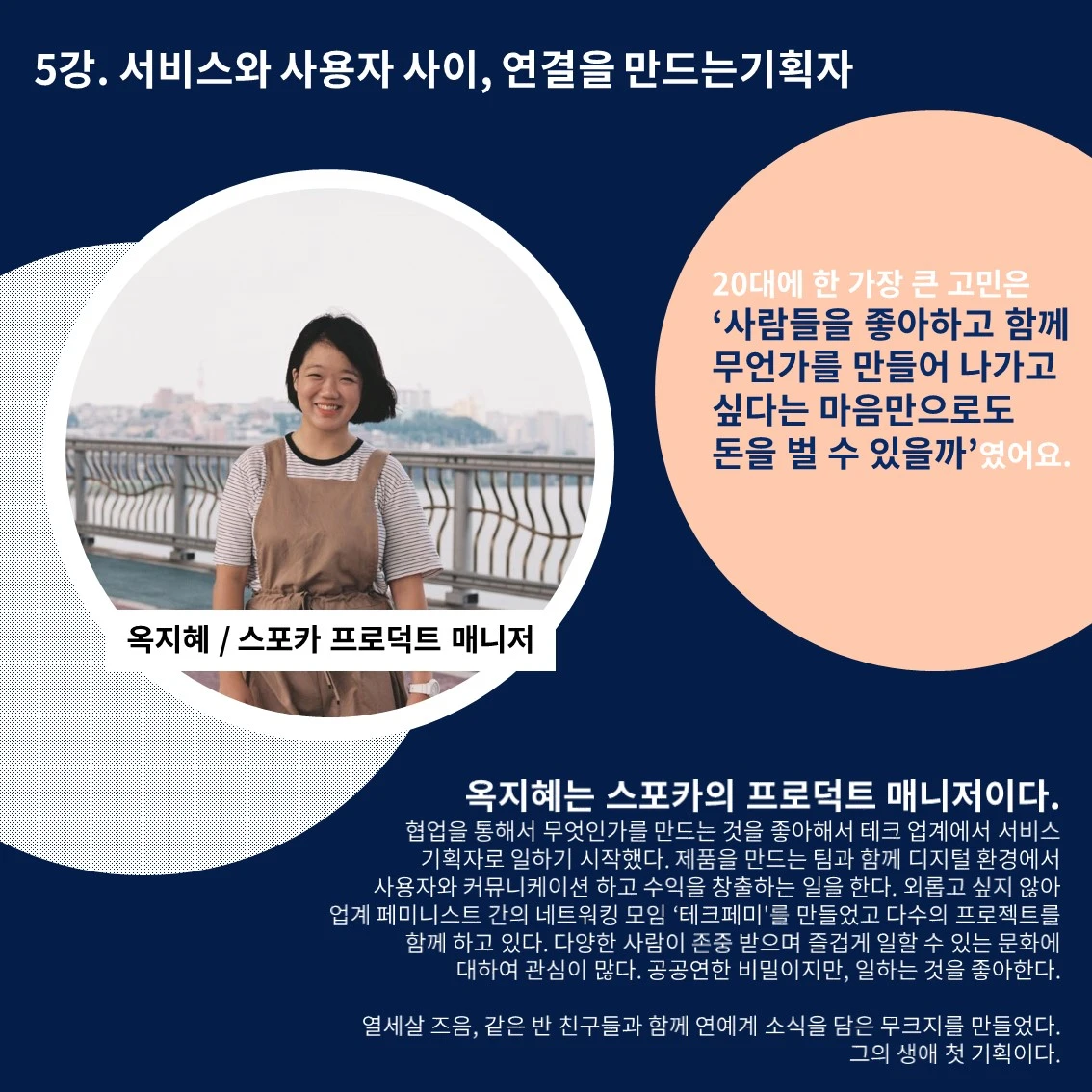 기획자학교's Point : 스포카 프로젝트 매니저이나 테크페미에서 활동하고 있는 옥지혜님은 7년차 기획자입니다. 프로덕트 매니저라는 직업을 사랑하고, 효과적으로 사람들 사이를 연결할 수 있는 방법이 무엇인지 끊임없이 공부하는 기획자! 덕분에 기획자학교의 기획자들도 서비스 기획이 무엇인지 이해하고, 한 번 해보는 과정을 즐겁게 경험할 수 있었답니다.