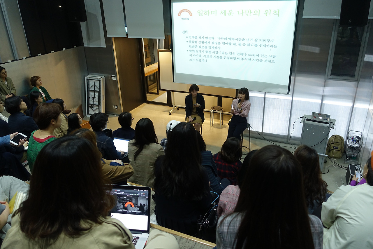예를 들면, 제가 N잡을 하기로 했을 때, 이걸 어떻게 해야 하는지 물어볼 선배가 없었어요. 실제 여성 선배들도 적었지만, 이 형태의 일을 경험해본 적이 없어서 저에게 유효한 조언을 하기가 힘들었죠. 그런데 제가 커리어를 쌓아나가는데 도움이 된 건, 이미 이전과는 다른 형태로 일을 하고 있는 동료들이었습니다. 프리랜서를 하던 친구에게 일과 쉬는 시간을 어떻게 나누는지 배웠고, 하드코어 N잡러인 친구에게는 협업 툴을 다루는 방법을 배웠고요. 그때 생각한 것은, 우리 세대의 문제를 푸는 데 있어서는 원숙한 선배들의 조언보다, 지금 고군분투하고 있는 우리 자신들의 경험이 더 유효할 수 있다는 것이었어요.