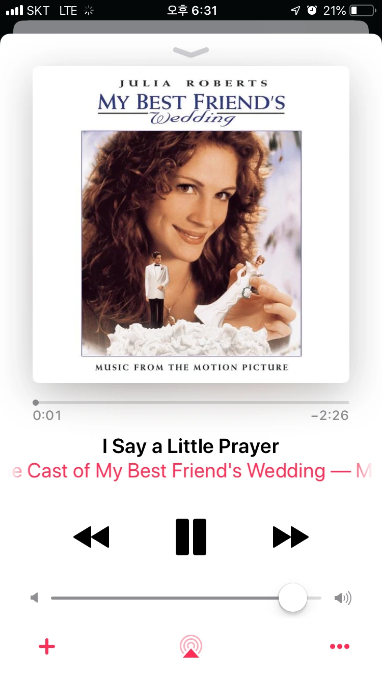 이 영화하면 바로 빠질 수 없는 장면. 옛 연인 마이클에게 질투를 유도하기 위해 부른 조지가 오히려 자신을 당황시키지만, 모두가 이 노래를 따라 부르기 시작하며 분위기가 한껏 달아올랐죠. 주인공 두명을 제외한 모두가 즐거워하며 불렀던, I say a little prayer 입니다.