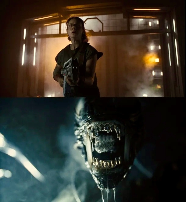 이번에 개봉한 <에일리언: 로물루스>는 이 에일리언 I 편과 II 편의 사이 시점에 일어난 일을 다루고 있었는데, 이후의 에일리언 영화들이 방향을 잃고, 프레데터랑 대결시키고 하면서 그동안 배가 산으로 많이 갔던 것에 비해, 초창기 I, II 편에서 보여준 특유의 미장센을 다시 보게 된 듯하여 반가웠다. 폐쇄된 공간에서의 어둡고 눅눅한, 뭔가 스멀스멀 찐득하게 올라오는 공포감을 잘 재현한 듯. 회사의 이익과 목적을 우선시하는 안드로이드와 인간의 갈등요소 역시 긴장감을 잘 유지시켜 주는 장치로 작용한다. 특히 시고니 위버가 나왔던 I 편의 노스트로모호에 탑승했던 안드로이드 애쉬(Ash)가 다시 등장한 것이 반가웠다.