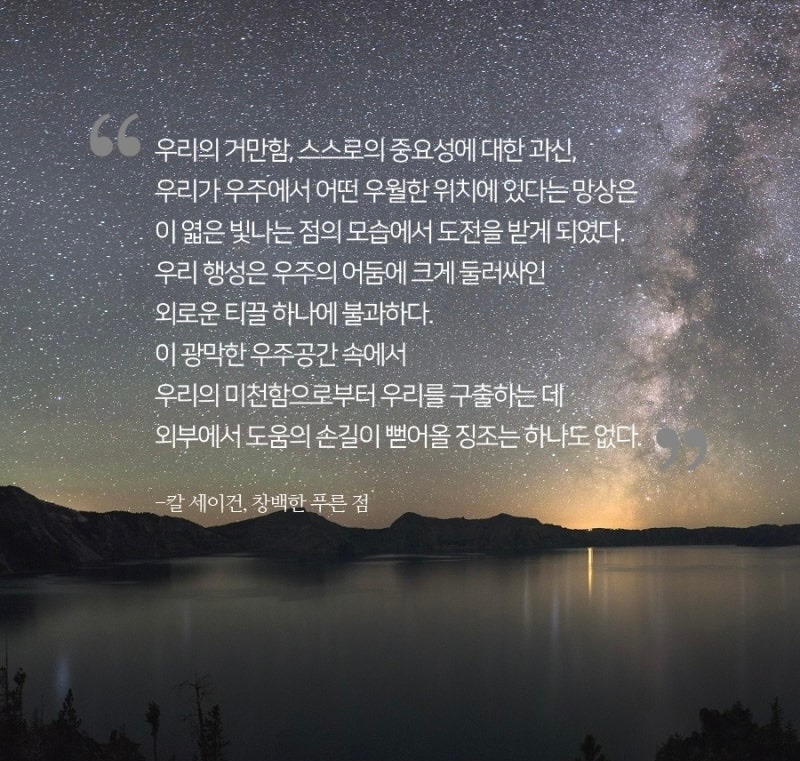 계속 반복되는 얘기이지만, 우주의 광활함 속에서 지구는 단지 '창백한 푸른 점'에 불과하다. 칼 세이건의 의견으로 머나먼 곳을 항해하던 보이저의 기수를 돌려 한낱 먼지처럼 보이는 '지구'의 사진을 찍어 전송했고, 그가 이 표현을 사용한 이후, 우리는 우리의 존재가 얼마나 보잘것없고 연약한 지를 더욱 깊이 인식하게 되었다. 그러나 동시에 이 작은 점이 현재까지 우리가 알고 있는 유일한 생명의 요람이라는 사실은 우리에게 더욱 큰 책임감을 안겨준다.