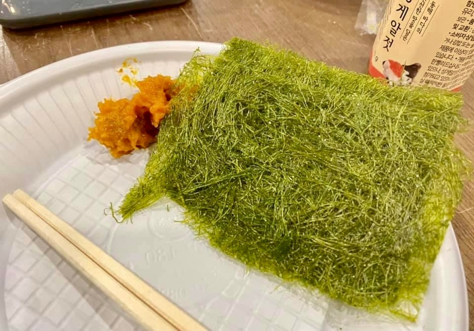 민어를 비롯한 모둠회와 함께 간장, 성게알젓, 히말라야소금, 초밥소스 등을 기막힌 식감의 감태에 제각각 버무려 먹은 싱싱한 초밥.