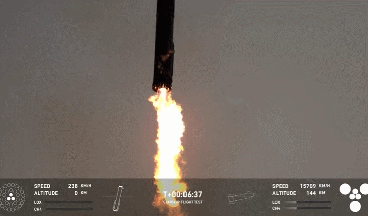 발사 약 3분 만에 전체 2단 발사체의 아랫부분인 슈퍼헤비 로켓이 상단 우주선 스타십에서 순조롭게 분리됐고, 발사 약 7분 만에 1단계 로켓 추진체인 슈퍼헤비가 우주에서 지구로 돌아와 출발했던 발사대로 수직 착륙하는 데는 발사탑의 ‘젓가락 팔’(대형 로봇팔)이 떨어지는 추진체를 공중에서 붙잡아 발사대에 거치하는 기술이 처음으로 시도됐다고 한다.