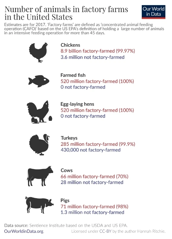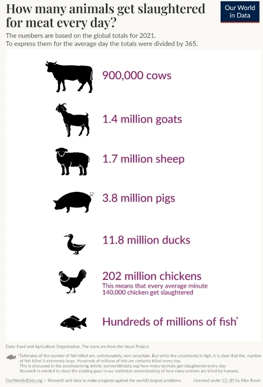 영국 옥스포드 대학이 운영하고 있는 Our World in Data(OWID) 홈페이지에는 ‘매일 얼마나 많은 동물들이 도살되나요?(How many animals get slaughtered every day?)’라는 제목의 보고서가 발표되어 인간이 소비하는 육류로 인해 매일 수십억 마리의 동물이 도살되고 있다는 사실을 알려주고 있다. 이 보고서에 따르면 매년 인간이 섭취하는 육류로 소비되기 위해 죽어가는 동물의 수가 무려 1,000억 마리에 달한다는 것. 충격적이지 않은가.