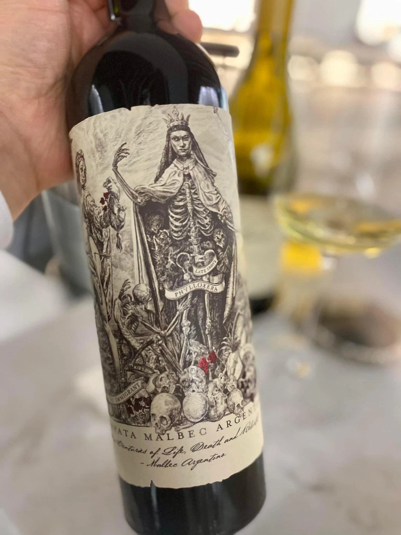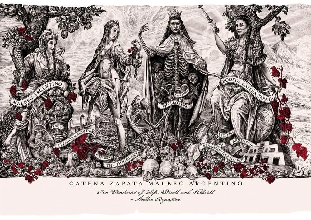 프랑스에서부터 아르헨티나에서 자리 잡기까지 말벡 품종의 서사를 라벨 속 4명의 여인으로 표현해 냈다. 말벡의 탄생을 상징하는 아끼텐의 엘레노어, 구대륙에서 신대륙으로의 이동을 상징하는 이민자, 구대륙에서 지게 된 말벡을 표현한 필록세라, 아드리아나 까테나의 모습으로 표현되어 신대륙에서의 말벡의 재탄생을 의미하는 까테나 자파타와 다양한 상징이 표현되어 있다.