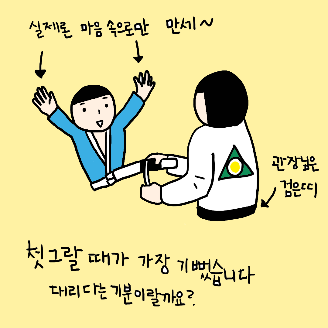 주짓수에 대해 많이 알고 계시는 것 같은데 무슨 띠세요?” 라고 누가 물어보면, 나는 늘 똑같이 부끄러워 하는 말투와 들릭락말락하는 볼륨으로 “흰띠입니다” 하고 대답한다. 겨우 흰띠 나부랭이(흰띠를 비하하지 않습니다. 저도 흰띠에요)에게 내가 이런 설명을 듣고 있었나 하는 자괴감과 ‘어이가 없네’ 감정이 뒤섞인 표정이 상대의 얼굴에 떠오르는데 그럴 땐 참 난감하다.