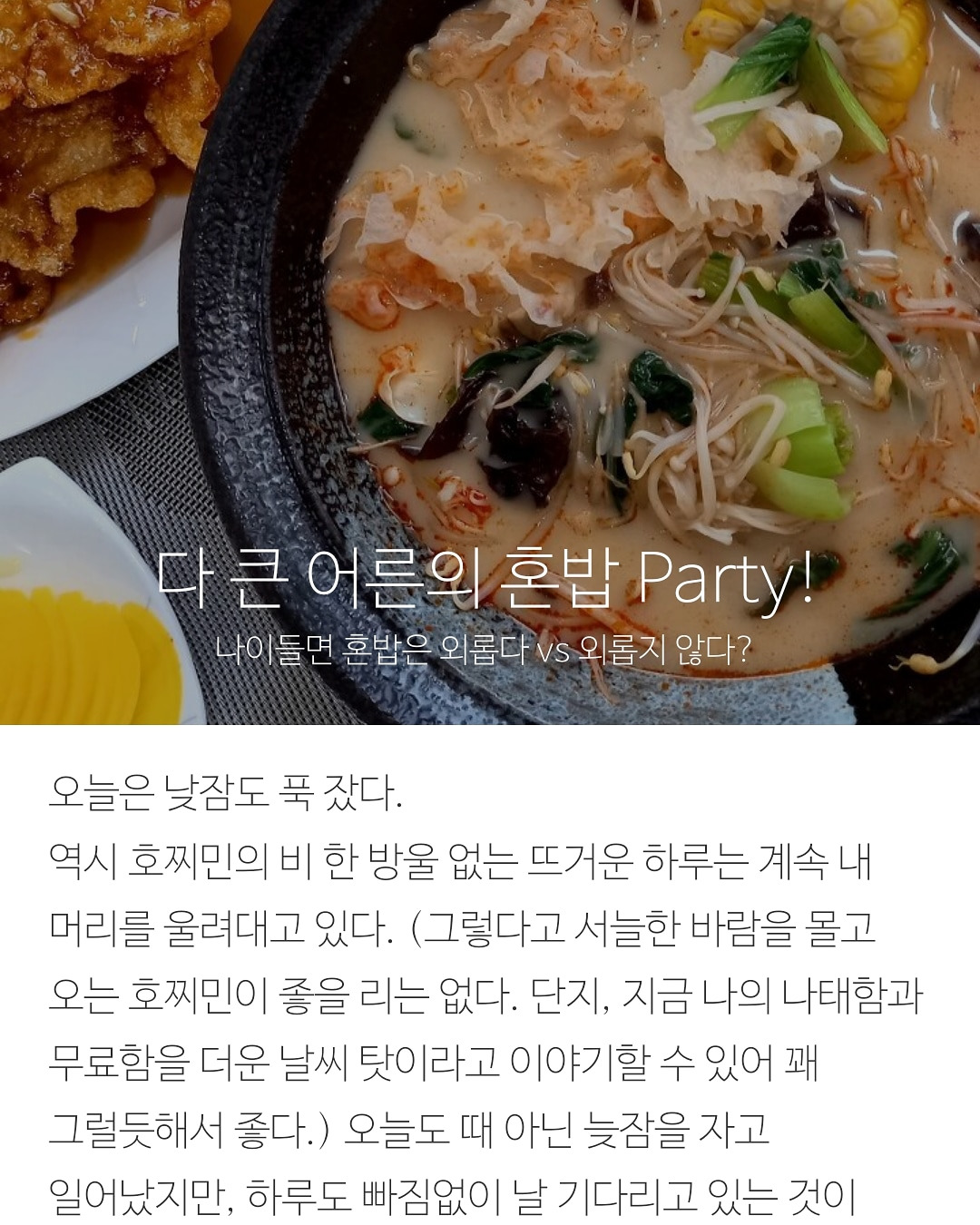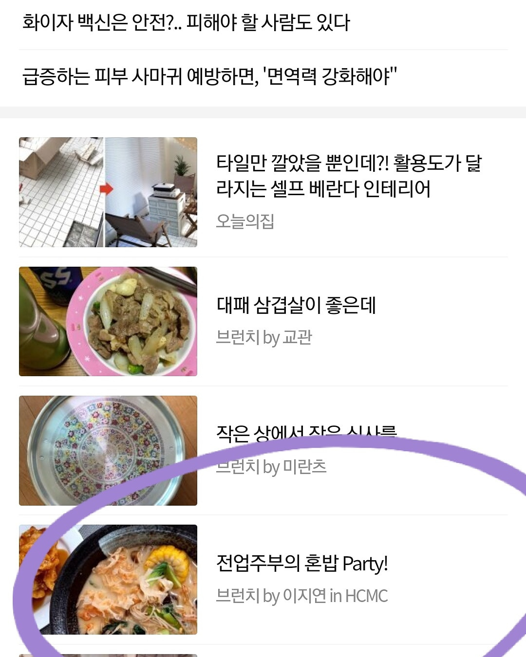 주변에서 글을 읽고 도움이 되었다고 칭찬해주셨다. 그리고 재미있었다는 이야기도 해주셨다. 이미 그것만으로도 내 목표는 달성한 기분이었다. 그런데 지난 금요일 갑작스러운 조회수 급상승을 겪고, 이게 무슨 일인가 싶어 조사한 결과 알게 되었다. 다음(Daum)과 카카오(Kakao) 페이지에 내 글이 올라와있었던 것이다. <전업주부의 혼밥 PARTY>!