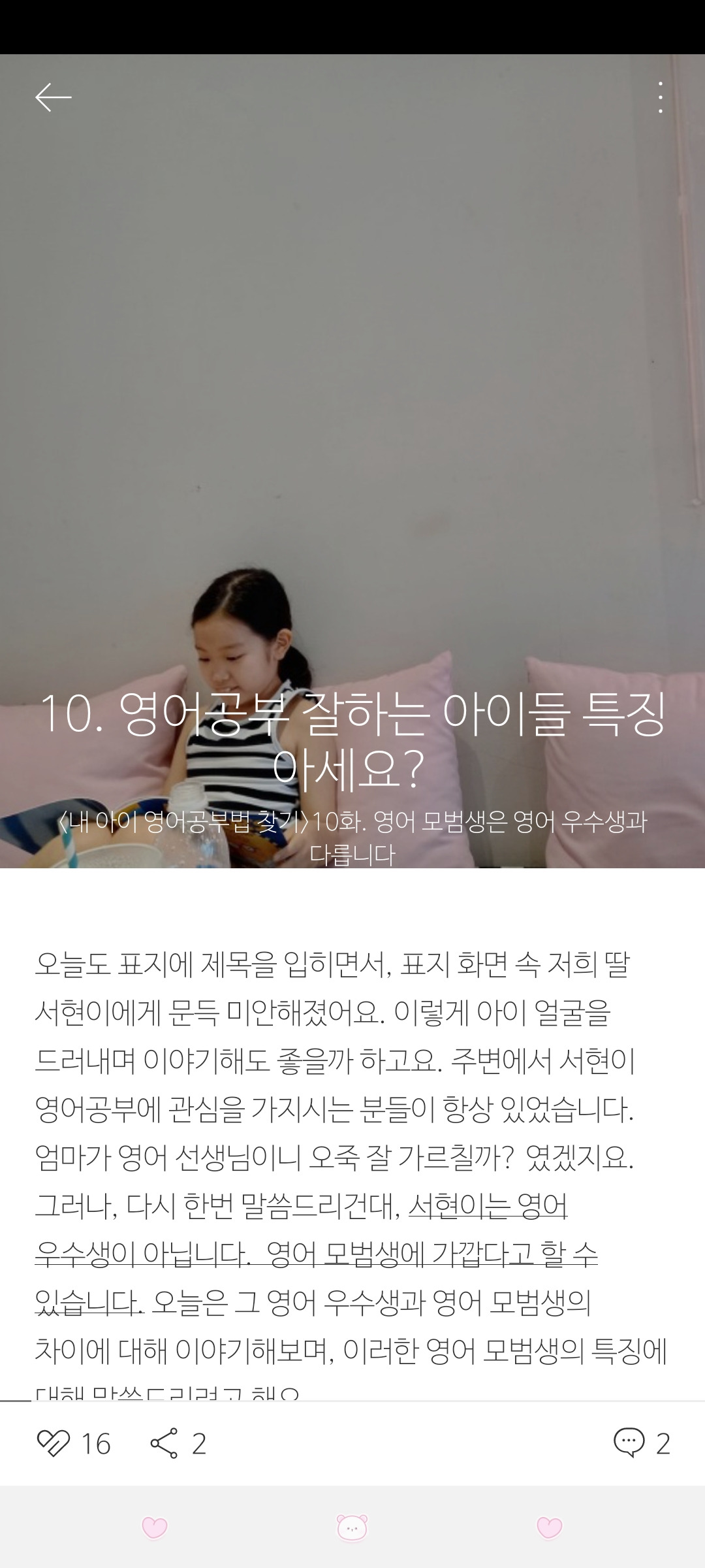 다시 조회수가 1000이 넘었다는 알람이 울려 , 이번에는 한번 겪어봤다고 침착한 마음으로 역시 Daum과 Kakao를 열어보았다. 역시 다시 내 글이 올라와 있었다. <내 아이 영어공부법 찾기>중 10화 "영어공부 잘하는 아이들 특징 아세요?"가 두 번째 효도를 하고 있다. 무엇보다 기쁜 것은, 내가 진심으로 정성을 들였던, 열심히 공부하고, 배움의 자세로 글을 쓰고 있던 글이 인정받은 기분 이어, 더할 나위 없이 기쁘다.