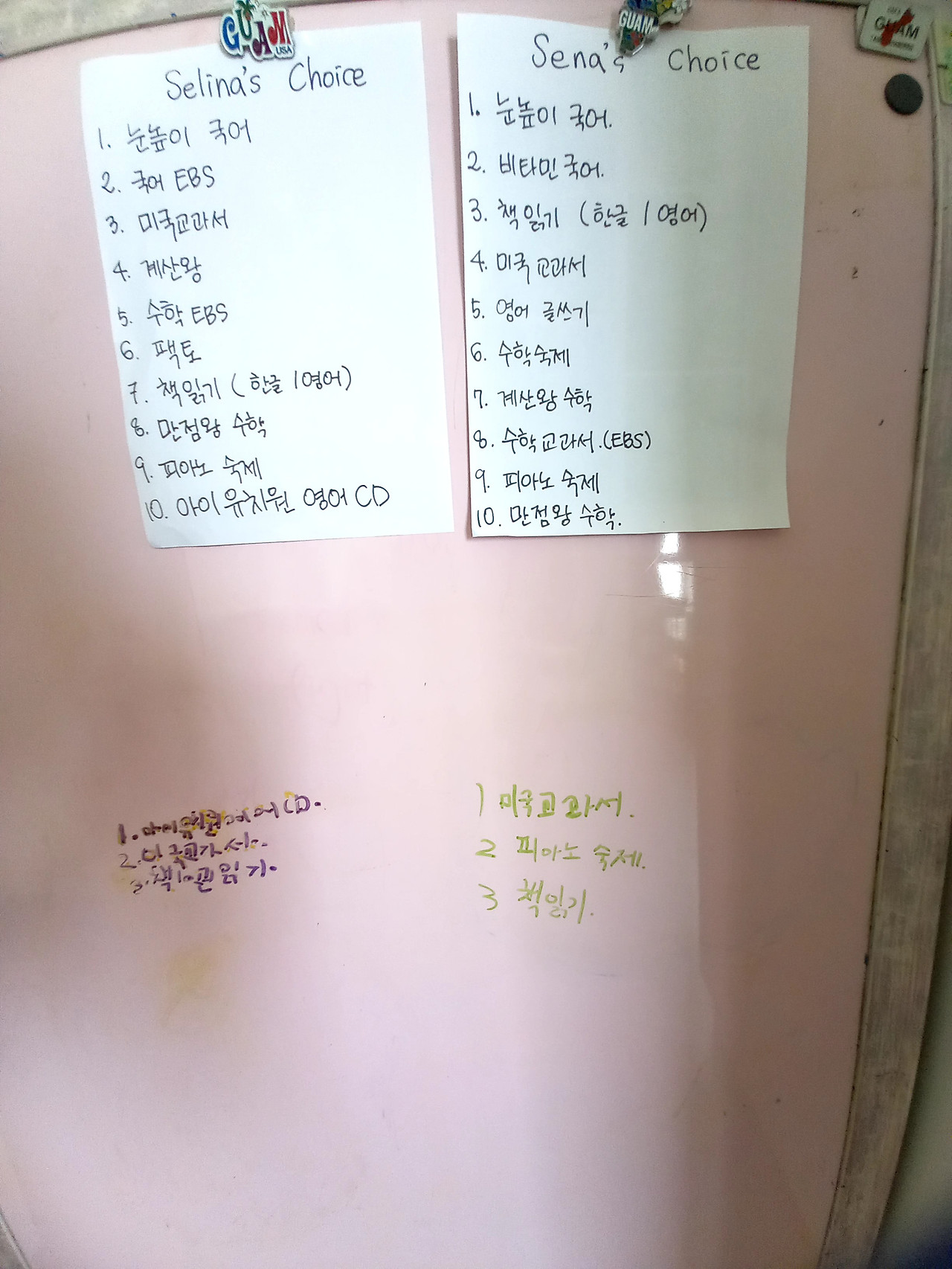 예를 들어 ‘책 읽기(한국 책 4권, 영어책 3권), 수학 학원 숙제’ 이렇게 마그넷 보드판에 작성합니다. 글자도 비뚤비뚤하고 어른들이 보기에는 엉성할 뿐이죠. 하지만 그다음은 아이들에게 맡겨보세요. 아이에게 수학 숙제했는지. 영어 숙제했는지 더 이상 추궁도 하지 마세요. "아가 보드판 계획 한번 확인해볼래?" 정도의 상기시킴 정도면 충분합니다.