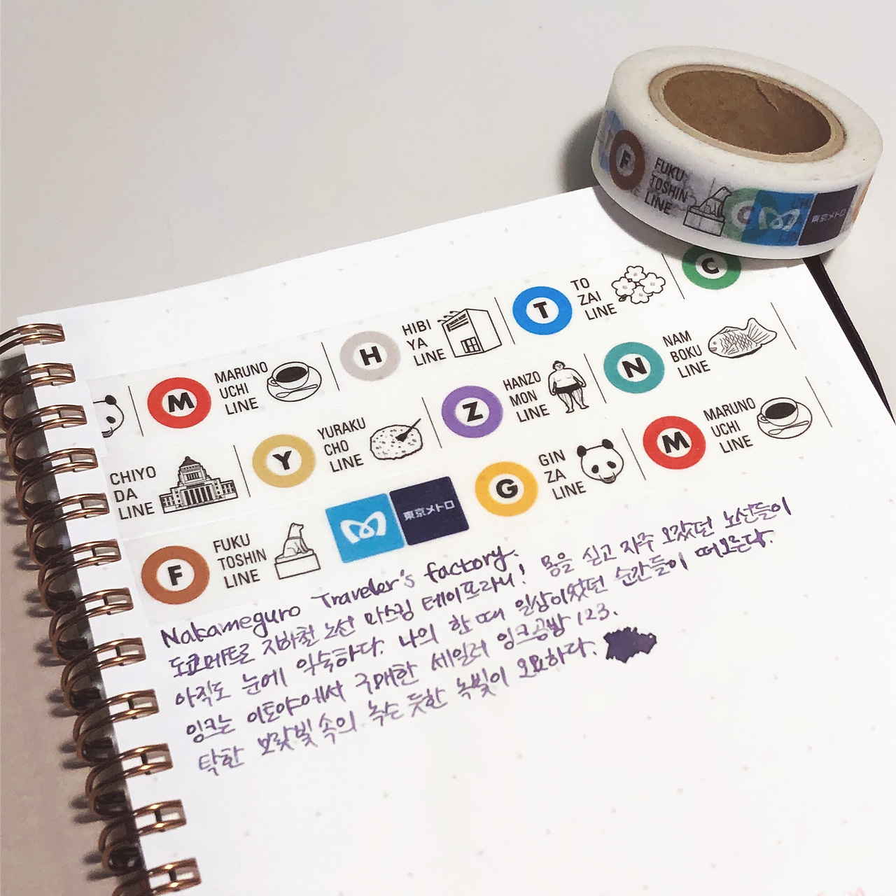 나카메구로의 트래블러스 팩토리에서 구매한 mt마스킹테이프 도쿄 메트로 에디션. 도쿄에서 교환유학하던 때 학교, 회사, 기숙사 근처에 도쿄메트로 노선의 역들이 많았습니다. 그래서인지 풍경없이 노선도를 나열한 그림이지만 저에겐 추억을 불러일으키는 멋진 아이템입니다. 도쿄메트로 노선들의 로고와 각 노선을 대표할 만한 심볼이 그려져있는데요, 여러분은 몇 개나 알아보셨나요? :) 히비야선의 심볼은 이 마스킹테이프를 구매한 트래블러스 팩토리 건물의 모양이네요.