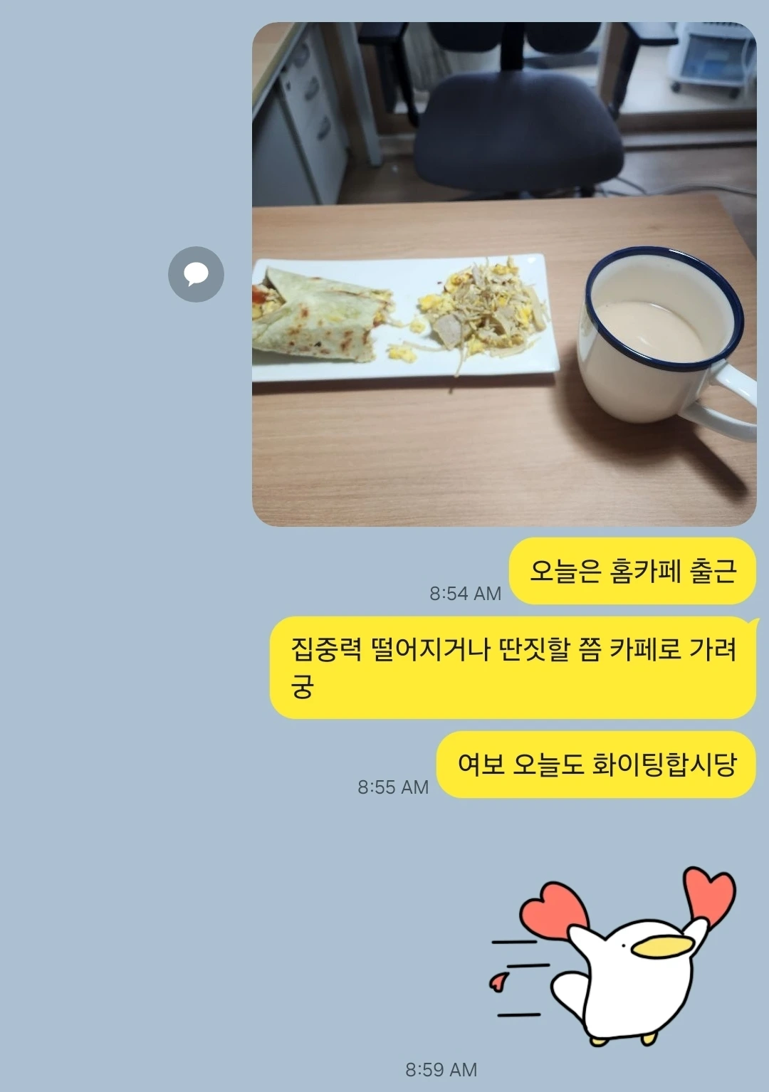 "노트북과 책을 챙겨서 가서 공부하고, 출근 도장 찍듯이 네게 톡을 보내줄게."