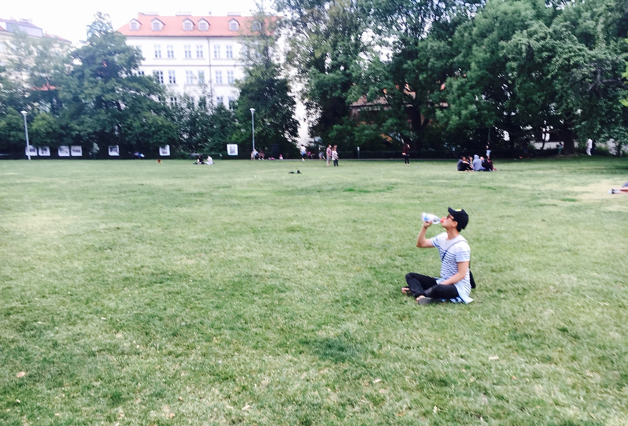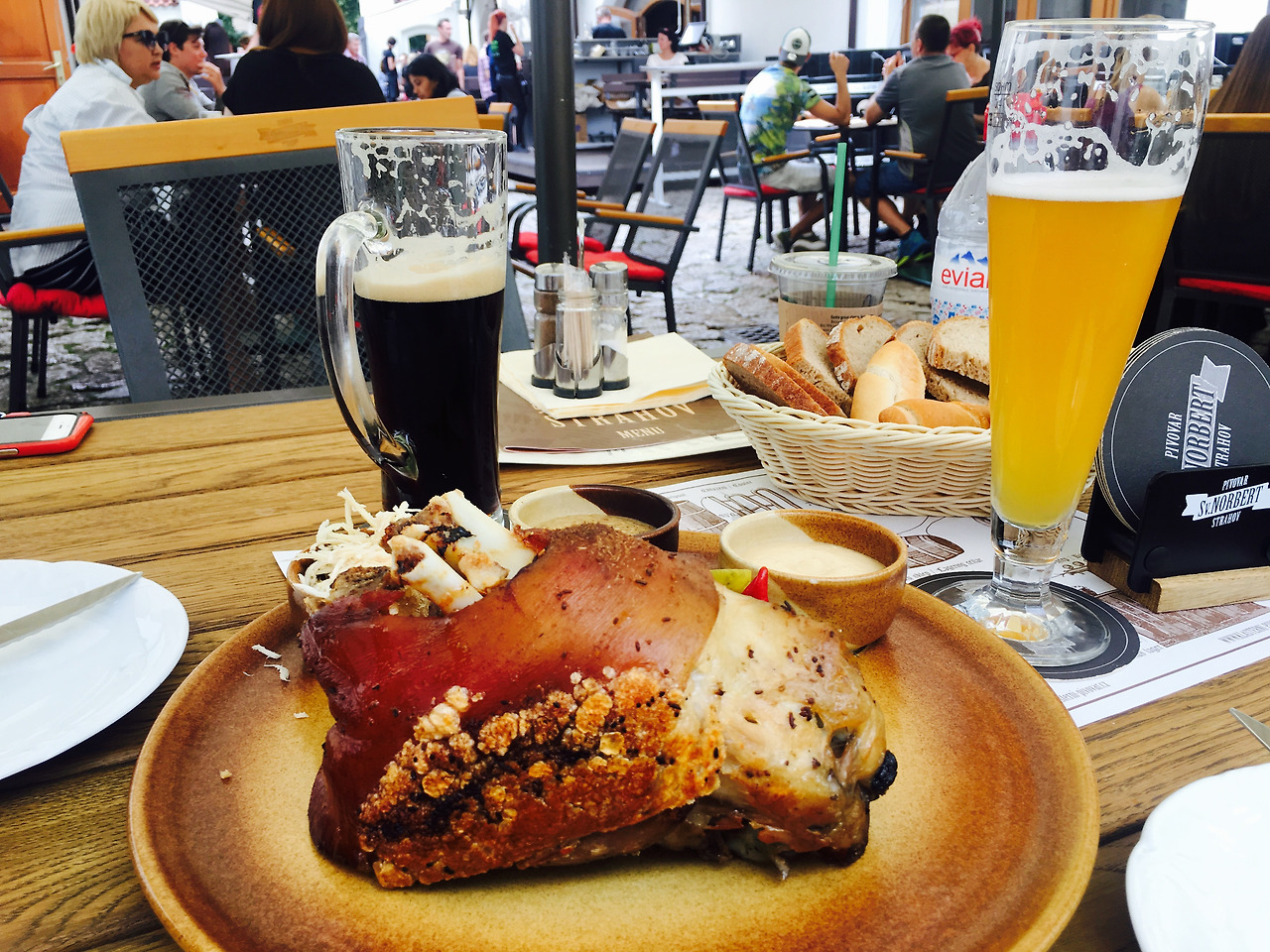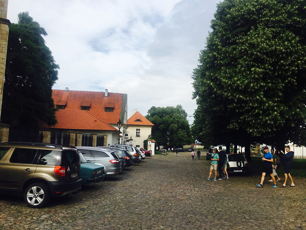 스트라호프 수도원의 야외 테이블에 앉아 숨을 고르며,