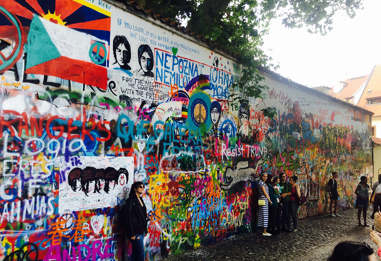 변화하는 역사의 결과물인 존 레논 벽 앞에 서서