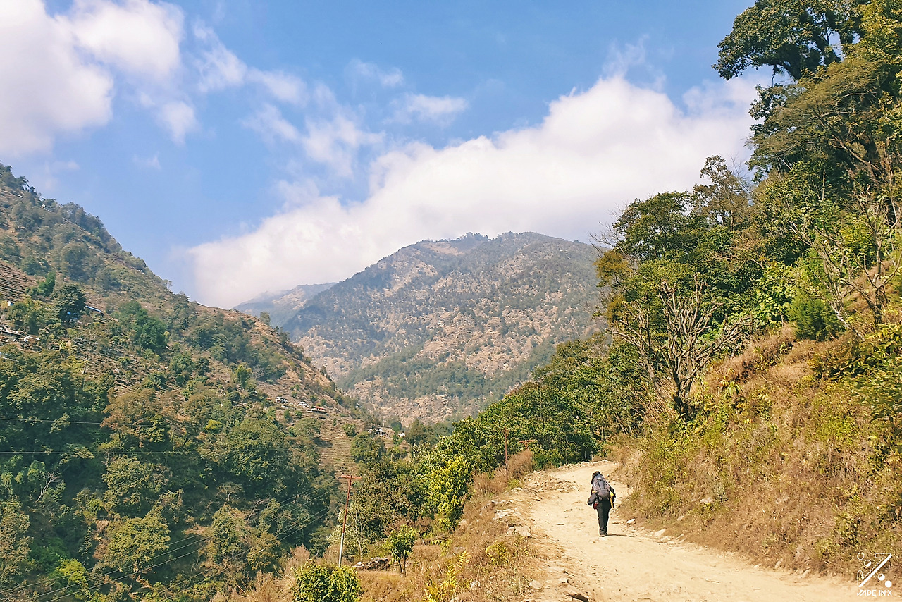 산으로 깊숙하게 들어갈수록 나무는 무성하고 농사가 끝난 계단식 논이 빽빽하다. 종을 울리는 양치기 소년과 양 떼에게 길을 비켜주며 잠시 멈춘다. 복슬복슬한 양의 관심은 온통 길가에 자란 풀을 향한다. 처음 걷는 아빠와 딸만 놀라서 얼굴의 모든 구멍이 동그랗게 커진다. 도로가 된 모래 길과 높게 자란 숲의 경계에서 가이드의 다급한 네팔어가 들린다. 가장 앞에서 걷던 포터가 걸음을 멈추고 줄줄이 제자리에 선다. 가이드가 미안한 표정으로 말한다.