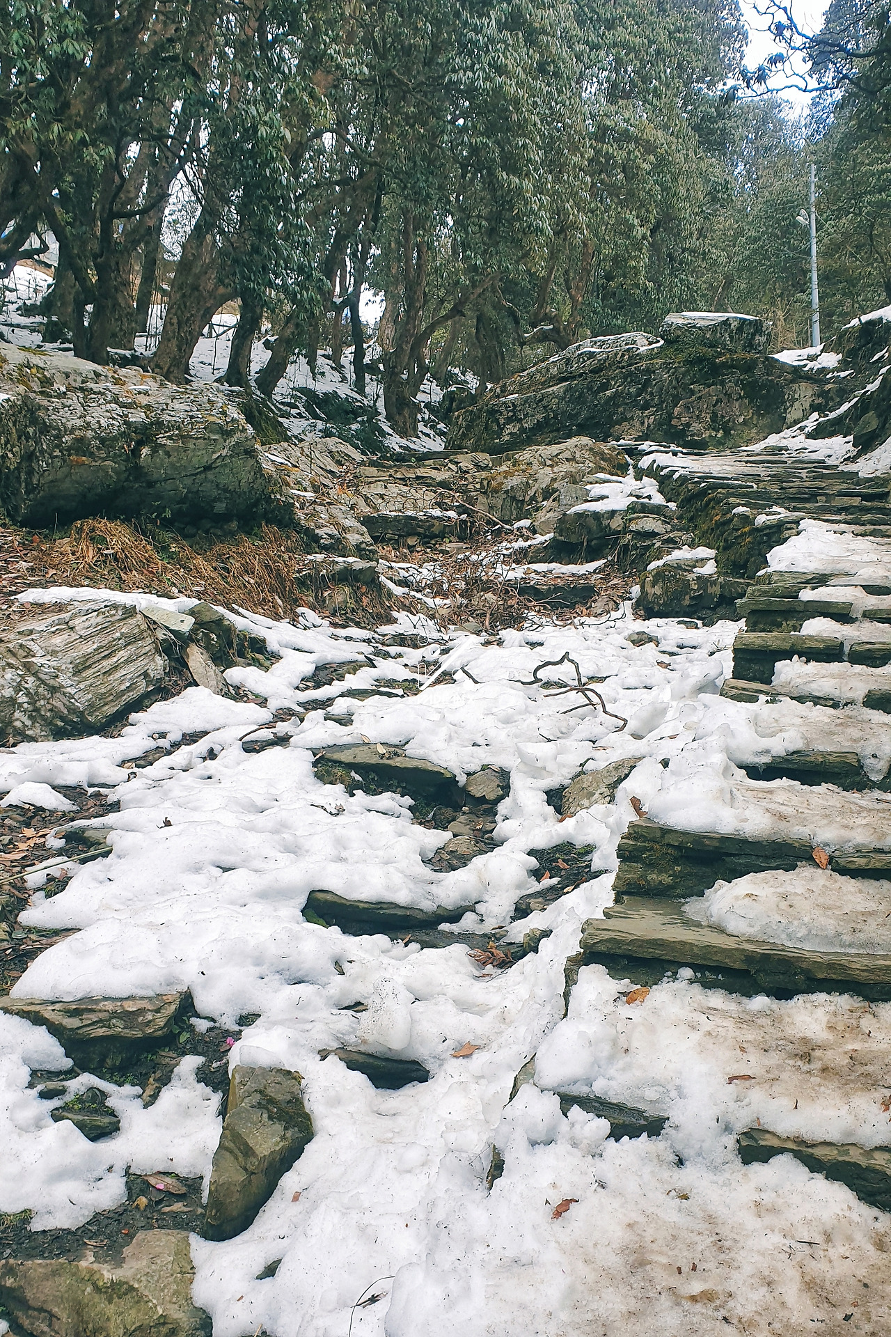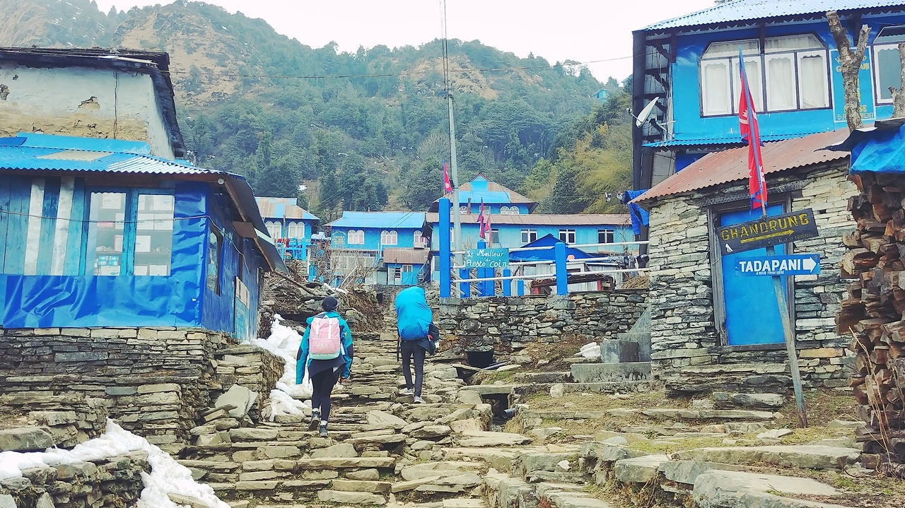해발 2,860m, 오늘의 도착지 고레파니 마을 입구에 다다르자 곳곳에 눈이 얼었다. 숙소에 도착하기 위해 차가운 느낌의 짙은 파란색 집들 사이를 걷는다. 거의 다 왔을 텐데, 가이드가 이제 곧 도착이라고 했는데, 계단을 오르고 올라도 끝이 없다. 살얼음으로 미끄러워진 돌계단을 걷기 위해 다리에 힘이 들어가고 숨이 턱 끝까지 차오른다. 마지막 계단을 밟고 허리를 펴며 롯지 입구 앞에서 바로 선다. 롯지 'Hotel Hill top'은 이름 그대로 마을 꼭대기에 있다. 두 뼘 너비의 좁은 길을 제외하고 마당엔 눈이 무릎까지 쌓였다.