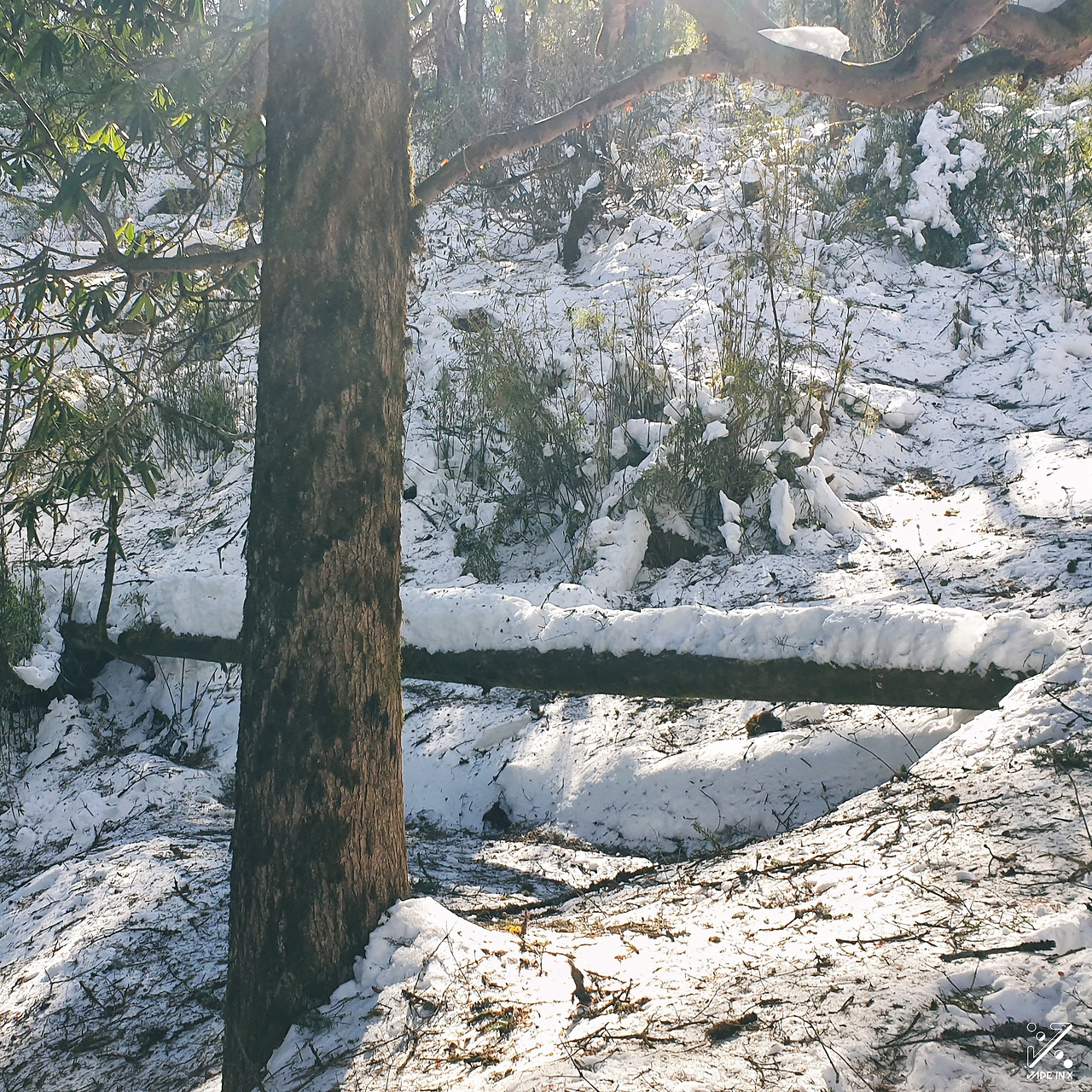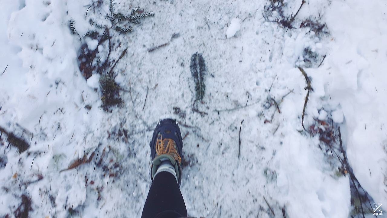 다음은 숲 속 내리막길이다. 길을 제외하고 아무도 손대지 않은 청정구역으로 거대한 나무 위로 눈이 쌓였다. 바닥엔 나무의 잎사귀와 잔가지가 콕콕 박혀 삐죽거린다. 나무가 쓰고 눈이 연출한 한 편의 낭만적인 작품이다. 거대한 서사의 판타지 영화나 동화 속 아름다운 삽화에서 볼 법한 경치다. 주인공은 나풀거리고 반짝이는 옷을 입은 요정일까? 당장 빨간 망토가 앞질러 뛰어간다고 해도 이해할 수 있다.