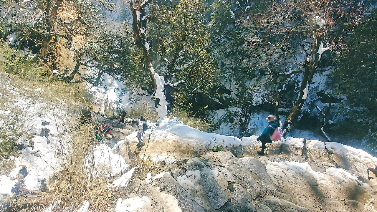 가이드는 경험이 적은 포터에게 아이젠을 양보한다. 그리고 천천히 걸을수록 쉽게 미끄러진다고 말하며 눈길에서 미끄러지지 않고 내려가는 시범을 보여준다. 스케이트처럼 최대한 빠른 속도로 한 번에 후다닥 뛴다. 다른 팀 포터들은 무거운 짐을 멘 채 가이드를 따라 한다. 겨울 산으로 출근하는 그들이기에 가능한 걸까? 그들도 사실 무서운지 뒤에서 외마디 외침이 들린다.