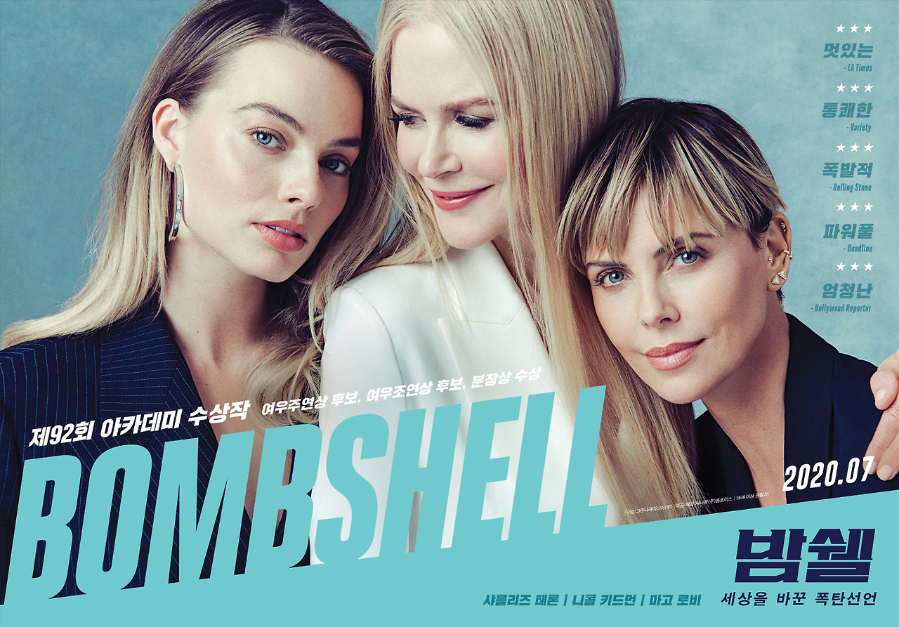 ‘밤쉘 : 세상을 바꾼 폭탄선언’는 미국 대선을 앞둔 시기, 폭스 뉴스 앵커였던 그레천 칼슨(니콜 키드먼)이 폭스 뉴스 회장 로저 에일스(존 리스고)를 직장 내 성희롱으로 고소한 실화를 다룬 영화다. 거기에 폭스 뉴스의 간판 앵커 메긴 켈리(샤를리즈 테론)와 카일라 포스피실(마고 로비)이 연관되며 각 인물들의 선택과 그에 따른 결과를 보여준다. 영화의 원제이자 ‘밤쉘(BOMBSHELL)은 생소한 단어이지만, 뜻이 1) 폭탄선언, 2) 놀랍고 충격적인 이야기, 3) 매력적인 금발 미녀라는 사실을 알게 되면 영화 내용을 복합적으로 암시한다는 확신이 생긴다.