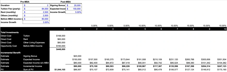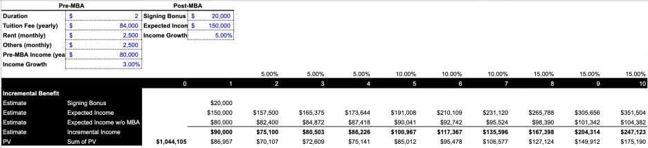 다음은 증분효용이다. 즉 MBA전대비 얼마나 경제, 비경제적 효용이 증가했는가이다. 여기서부터 사실상 가장 많은 '가정'이 들어가게된다. 나의 졸업 후 예상임금은 어느 정도일지(크게 사이닝 보너스와 기본급으로 구성되고 이외에 RSU같은 매년 받게되는 주식보상도 포함되게 되는데 간단하게 입사 초 받는 사이닝과 기대임금 두가지로 나누었다), 둘째 매년 임금인상률은 어느정도인지(이또한 이직등 다양한 변수가 있다), 마지막으론 향후 금리는 어떤 궤를 그리게 될지(미래 Cash Flow의 할인율도 사용된다)등 정확한 ROI를 계산하기 위해선 일종의 '모델 단순화'가 필요하다. 내가 쓴 가정들은 크게 아래와 같다.