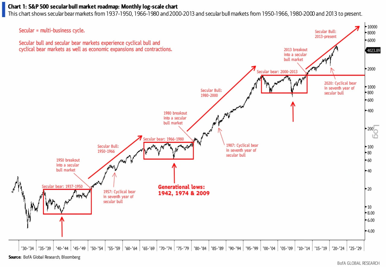 NDR의 Tim Hayes는 "계속되는 세큘러 불 상황에서는, S&P와 ACWI에서 각각 현재 기록적인 고점에서 16%와 14% 떨어진 지점인 지금 시점에서 주요 지표들이 상승 추세를 이어갈 것으로 예상됩니다"라고 말했다. 여기서 'Secular'은 'Cyclical'의 반대개념으로 보다 방향적인 추세를 의미한다.