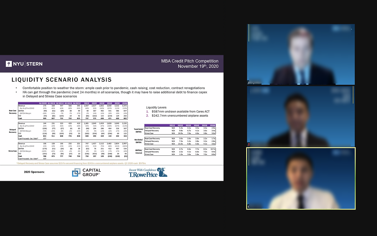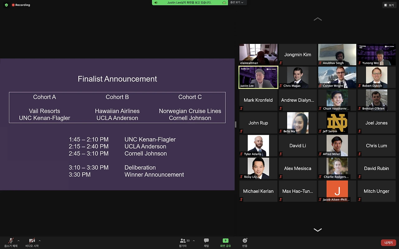 클럽활동 다음으로 가장 많은 힘이 들어가면서도 1st year동안 가장 중요하다고 할 수 있는 분야가 competition이다. 대게 fall 쿼터 시작부터 수많은 컴피티션이 열리게되고 (대게 전략 컨설팅) 크게 주최측은 1) 컨설팅펌 같은 회사, 2) B-school, 3) non-profit 단체 등으로 나뉜다. 가장 mba생들이 에너지가 넘치는 시기이기 때문에 이 때 가장 slack 채널에서 관심있는 컴피티션별로 team up을 하기위해 분주해진다. 나같은 경우는 finance 쪽 백그라운드가 있기 때문에 (전략은 전혀 관심도 없었다), 두 가지 컴피티션을 참가했는데 하나는 Anderson에서 치뤄진 IFA Stock Pitch Competition과 national 규모로 이뤄진 Stern Credit Pitch Competition에 나갔다. 하나는 내 주분야였던 equity였고, 다른 하나는 잘 몰랐던 credit분야였는데 다른 2명의 팀원과 최대한 각자의 특기를 레버리지해가며 열심히 했던 것 같다. 내겐 가장 기억에 남았던 경험 중 하나. 결과는 모두 2등이었고 특히 Stern 발표는 다른 b-school들과 경쟁을 해야했고 우리는 Anderson을 대표로 나간 것이었기 때문에 더 의미있었다 (1등은 UNC, 3등은 Cornell이 했었다.) 클럽활동보다 이런 national cometition에서 입상하게 된다면 resume가 아주 강력해진다. 나는 그래서 컴피티션은 꼭 가을동안 참여해 입상이라도 할 수 있게 도전해보기를 추천한다. 주최측이 회사인 경우, 향후 해당 회사 리쿠르팅시 매우 큰 이점을 가질 수 있다.