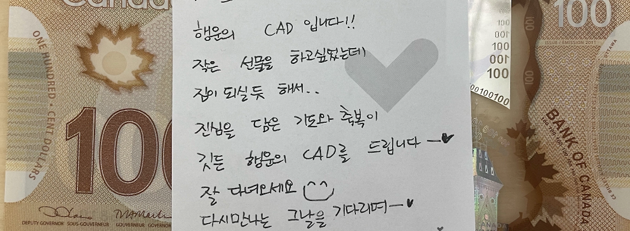 존경해 마지않는 외숙모님이 챙겨주셨던 미국 달러를 과감히 꺼내 캐나다 달러로 환전했다. 애정하는 직장 동료가 기도와 축복을 담아 챙겨준 '행운의 CA$100'까지 꺼냈다. 정산 후 아슬아슬하게 단 2달러만이 남았으니 정말이지 행운의 달러가 맞았다.