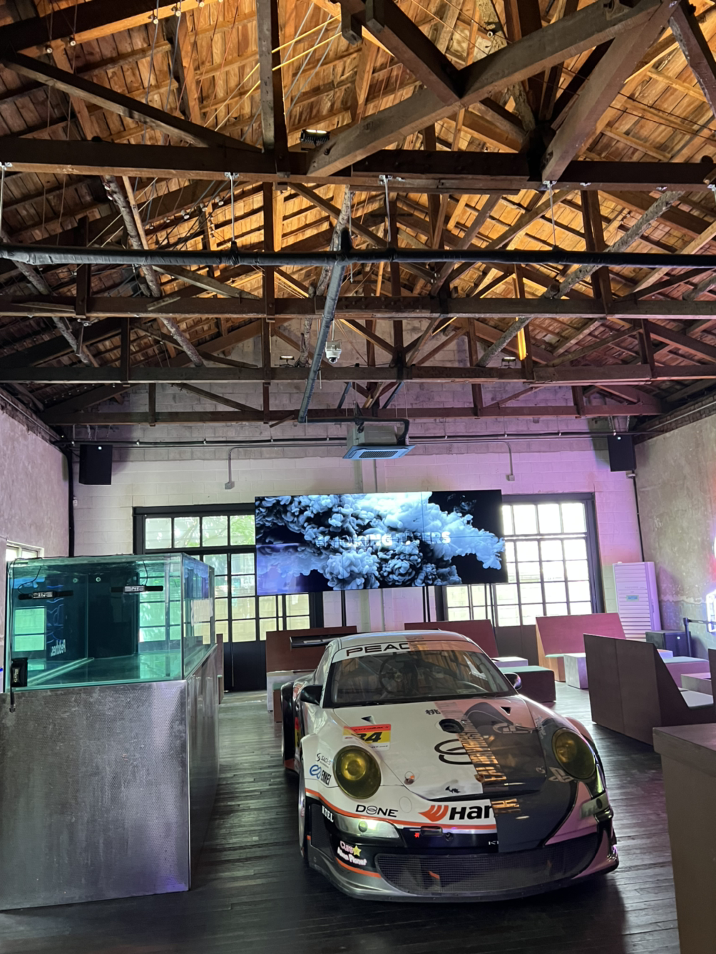 만약 원래의 노티드대로 귀엽기만 했다면 고딩래퍼가 랩을 해도 손색없을 힙한 공간과 어우러지지 않았을 거예요. 시멘트 벽지를 그대로 드러내고, 화려한 영상과 빈티지카가 비치된 자리인 만큼 노티드도 자기 색을 한 톤 바꿨더라구요. 원래의 노티드가 8세라면 여기서의 노티드는 16세 정도. 노랑, 분홍의 어린 티를 벗고 회색빛의 시크함이 어울릴 만큼 나이를 먹은 거예요. 나이와 성격이 바뀌는 '살아 있는 브랜드'를 직접 만난 느낌이었죠.