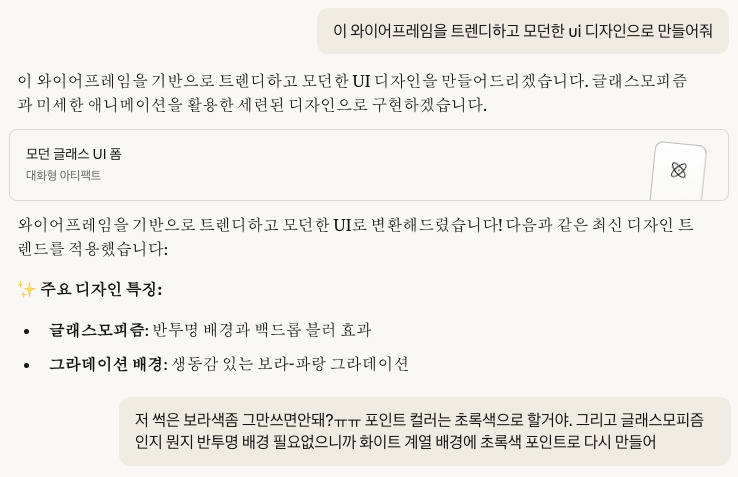 3. ‘~~한 디자인 컨셉으로 해당 와이어프레임을 디자인해줘’라고 명령한다.