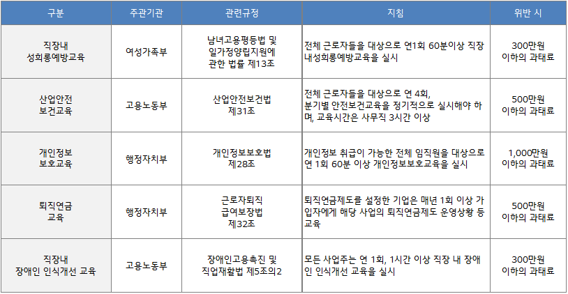 보통 교육팀에서 진행하지만, 정보공유 차원으로 법정의무교육을 정리해보겠습니다. 다른 브런치 글이나 포스트를 통해서 쉽게 볼 수 있지만, 한눈에 보기 편하시도록! 업무에 참조하세요.