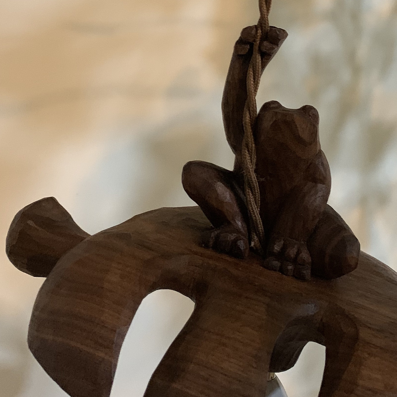 완성된 개구리를 얹어주고, 개구리 손에 전선도 쥐어주고, 마무리 오일 마감 후. 등을 켜본다.