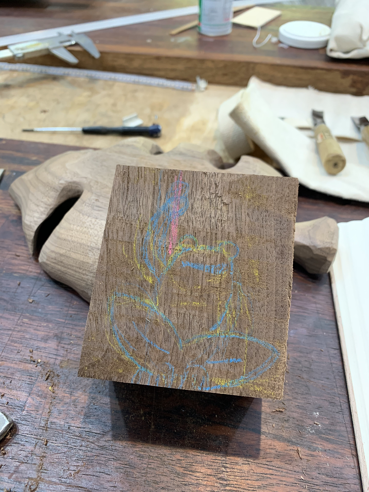 수업 전부터 이런저런 그림을 그리며 고민을 거듭했는데, 언제나 디자인이 제일 어려운 것 같다. 작업이 끝나면 나는 세상에 하나뿐인 완성품을 갖게 되지만, 우선 작업에 앞서 디자인을 정하기까지 세상에 없던 무언가를 구상해본다는 건 정말 머리 아픈 일이다. 몇 개의 디자인을 그려서 가져갔지만, 너무 심플한 건 카빙의 맛이 없으니 빼고, 등을 만들기에 현실적으로 어려운 디자인도 빼고, 이래저래 빼고 나니 남는 게 별로 없었다. 결국 카빙의 맛을 충분히 살릴 수 있으면서, 이전에 한 번 작업해본 몬스테라 잎 디자인으로 결정했다. 뒤집어진 잎에, 잎 위에는 개구리가 앉아 있는 디자인으로.