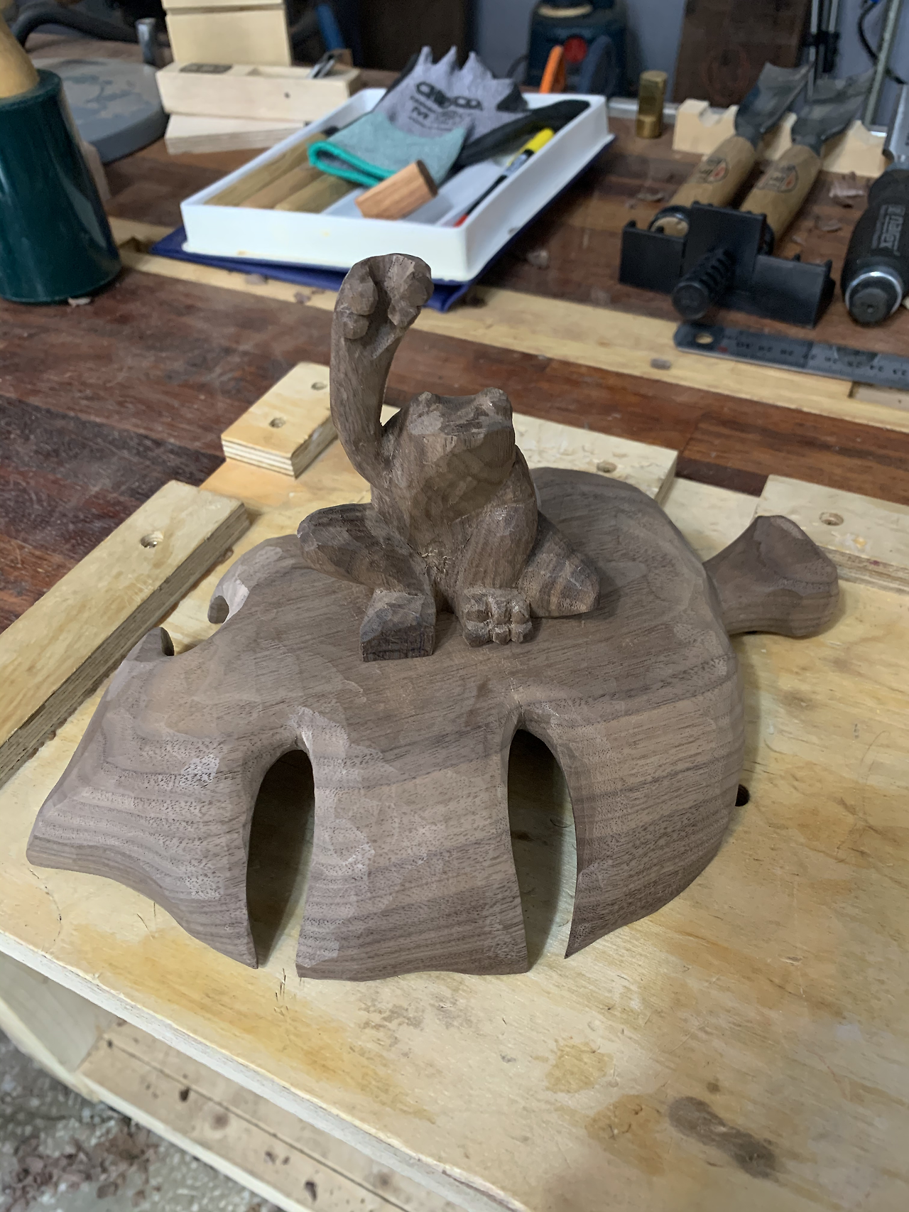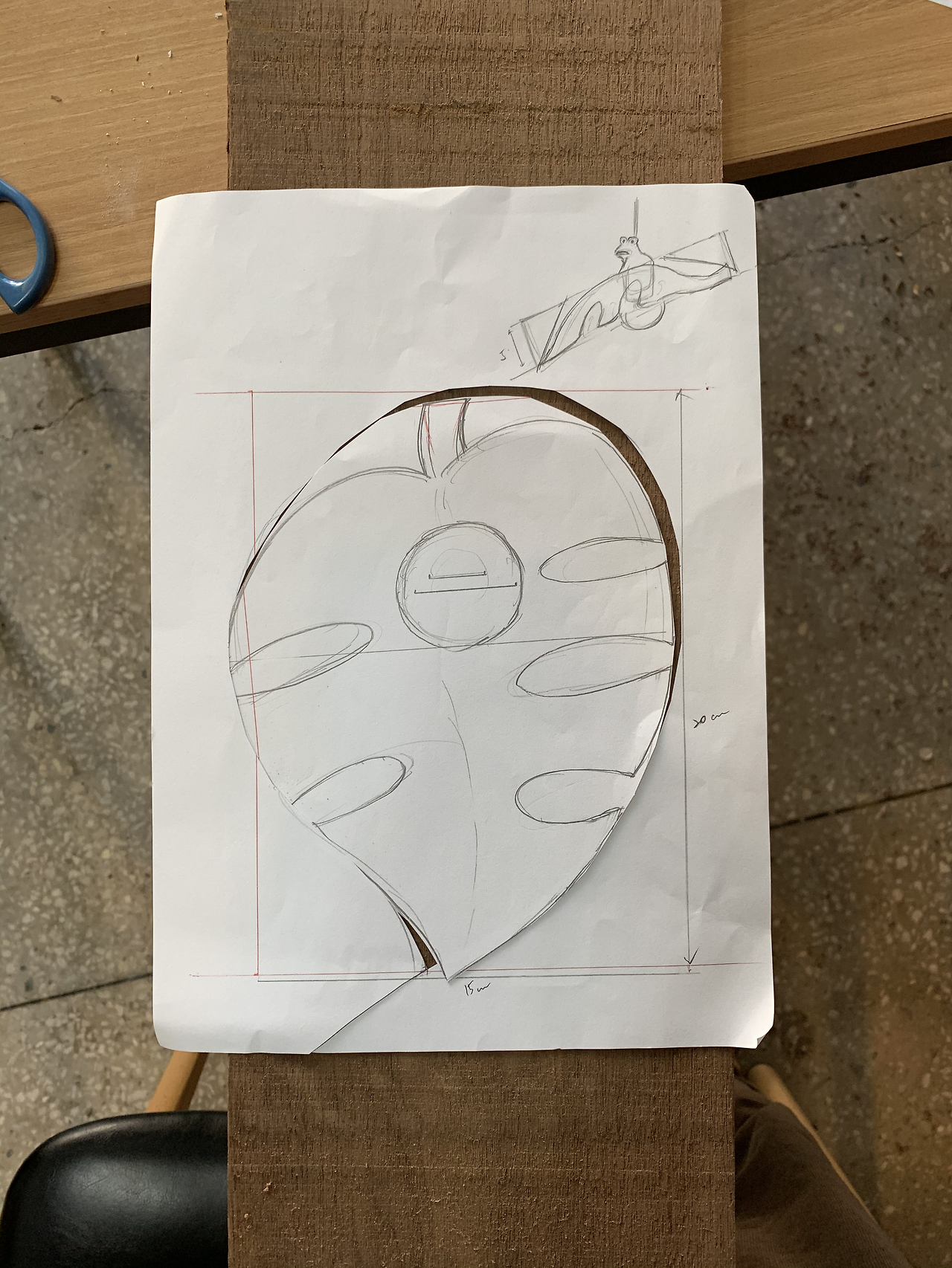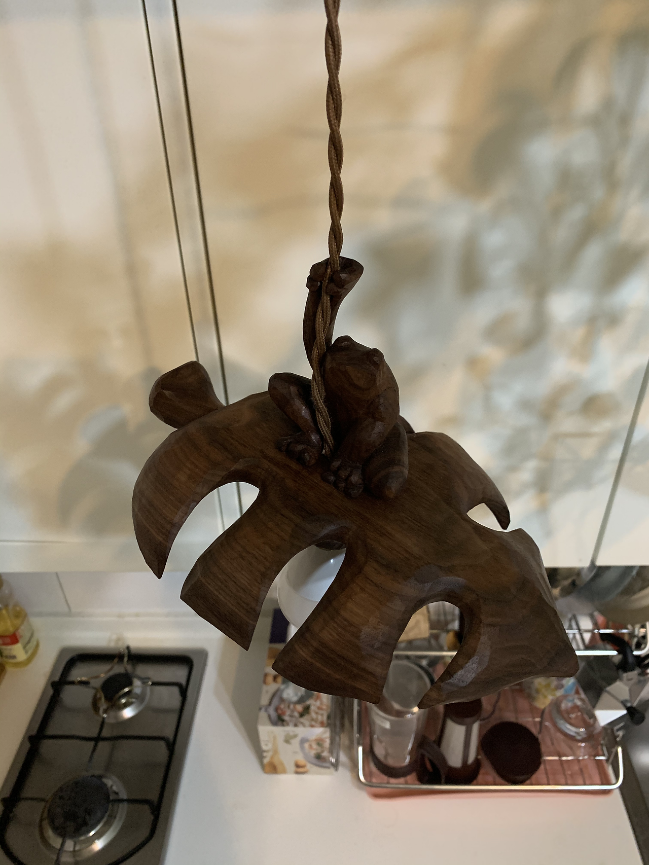 디자인 결정 후, 작업실에서 간단히 몬스테라 잎을 나무에 그리고 재단, 소켓 부분을 남기고 깎기에 돌입했다. 몬스테라는 이미 한번 깎아본지라 비교적 수월하게 깎았다. 크기가 커지니 오히려 큼직하게 덜어내기가 편했다. 그러나 개구리는 막상 깎으려니 시작이 어려워 선생님의 힘을 빌렸다. 선생님이 대략적인 모양과 개구리 얼굴 반쪽의 형태를 잡아주셔서 간신히 감을 잡고 완성할 수 있었다.