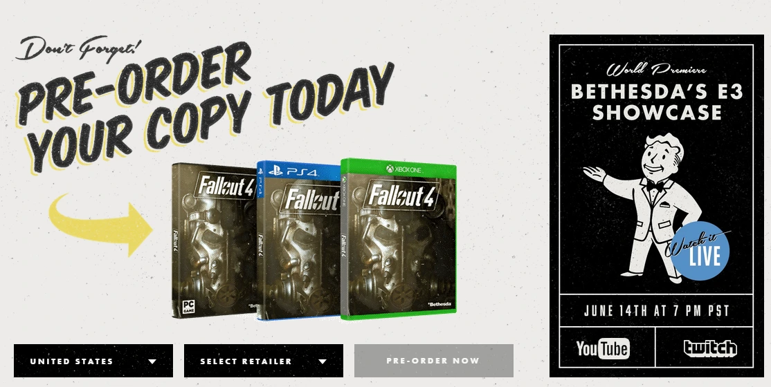 그 뿐 아니라 폴아웃의 세계를 미리 느껴볼 수 있는 모바일 게임 < FallOut Shelter>를 발표 당일에 앱스토어에 출격시켜 심장 마비로 쓰러진 팬들에게 전기 충격까지 가하는 잔인무도한 모습까지 보였다.