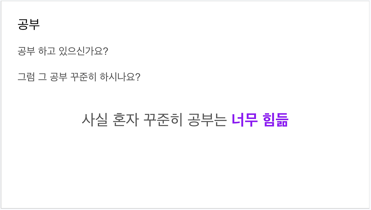 그리고 저도 애니메이션은 가끔 사용하는데 제 경우에는 한 화면에서 질문을 던지고, 이에 대한 답을 같은 화면에서 보여줄 때 이 말의 순서에 맞추어서 애니메이션을 사용합니다. 예를 들어, 맨 위 스크린샷의 "사실 혼자 공부는 너무 힘듦"은 애니메이션으로 공부 꾸준히 하냐고 물어본 후에 제가 클릭하면 나오게 했습니다. 그러면 제 공부하냐는 질문을 받아서 생각하다가 그 결론을 볼 수 있게 되는 거죠.