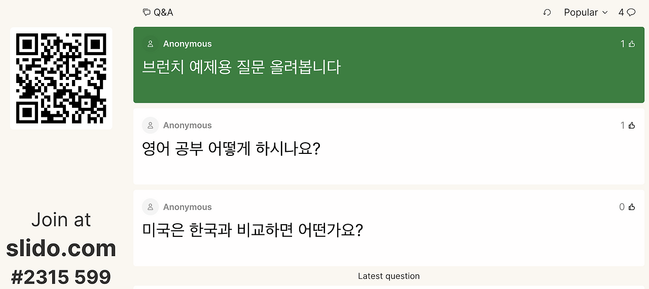 전 발표하는데 청중 규모가 수십 명 이상으로 많아지면 먼저 손 든 사람 질문을 받는 게 아니라 슬라이도( https://slido.com/ )로 질문을 받습니다.