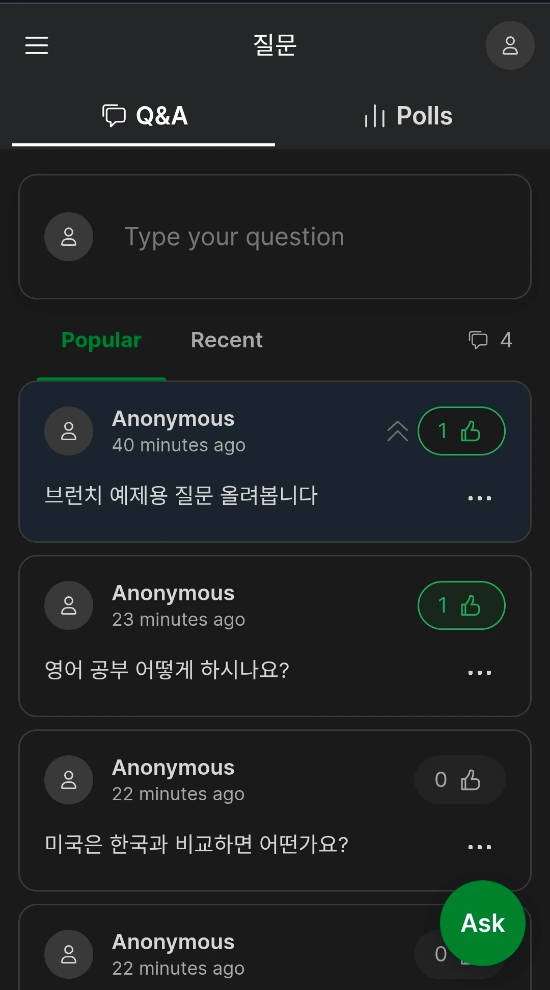 당장 내가 질문이 없어도 이미 올라온 질문들을 볼 수 있기 때문에, 자기가 하고 싶었던 질문이 있거나 좋은 질문이 있으면 좋아요를 누를 수 있습니다.