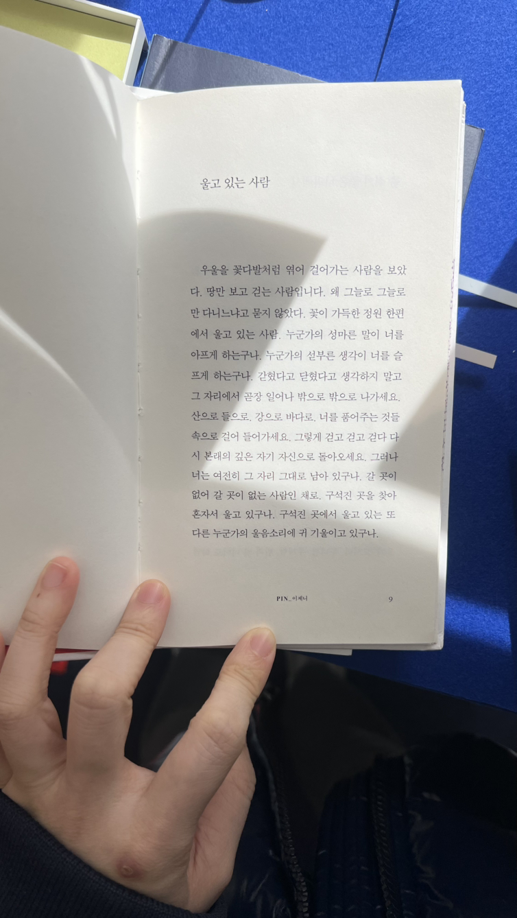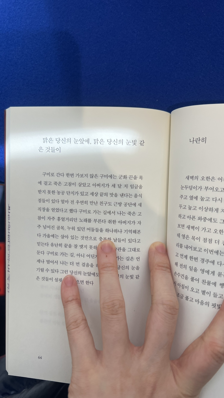 이야기가 흥미로운 소설보다는 아름다운 문장을 수집하는 게 좋다. 맑은 단어들과 모호하지 않고 오히려 투명하여 바로 관계성을 지을 수 있는 문장들을 나의 메모장에 가득 담고 싶다. 그리고 언제든 펴내어 읽고 싶다. 버스, 카페, 길거리에서 열어볼 나만의 책이 되는 거다.