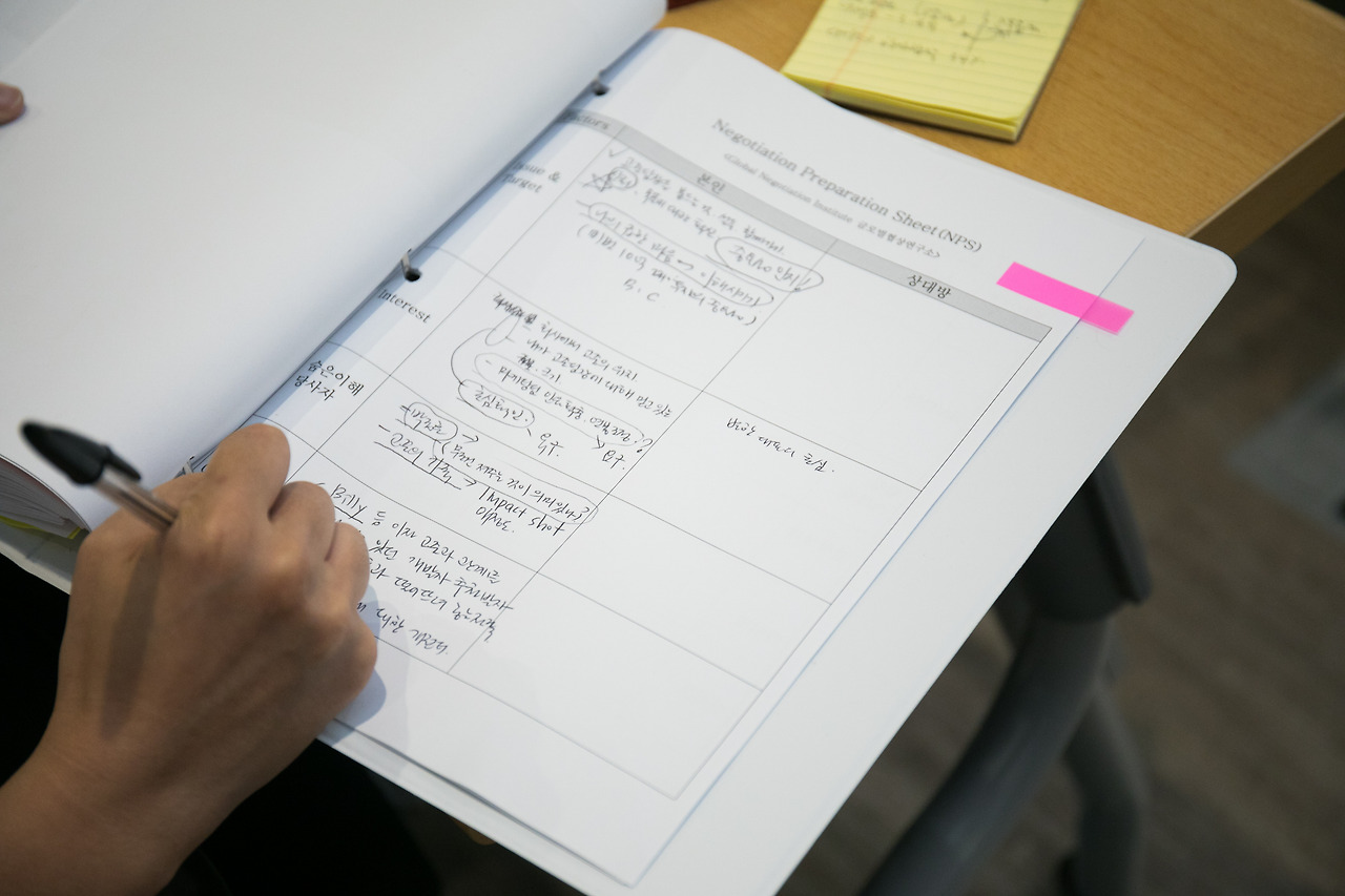 2016년 여름, <YES를 이끌어내는 협상법>의 공동 저자이신 브루스 패튼 교수님이 리딩하셨던 하버드로스쿨의 협상프로그램(PON)에 참여했을 때 세계 최고의 협상교육기관의 교육기획 방식과 진행방식을 눈으로 확인할 수 있었습니다. 비즈니스협상전략그룹이 기획한 협상프로그램 역시 하버드식 협상교육 방식을 기반으로 협상강의의 비중을 30%로 유지하고, 나머지 70%의 시간을 독자적으로 개발한 실전 협상 시뮬레이션을 활용하여 실제로 협상을 해보고 이에 대한 영상피드백을 받을 수 있도록 기획하였습니다.