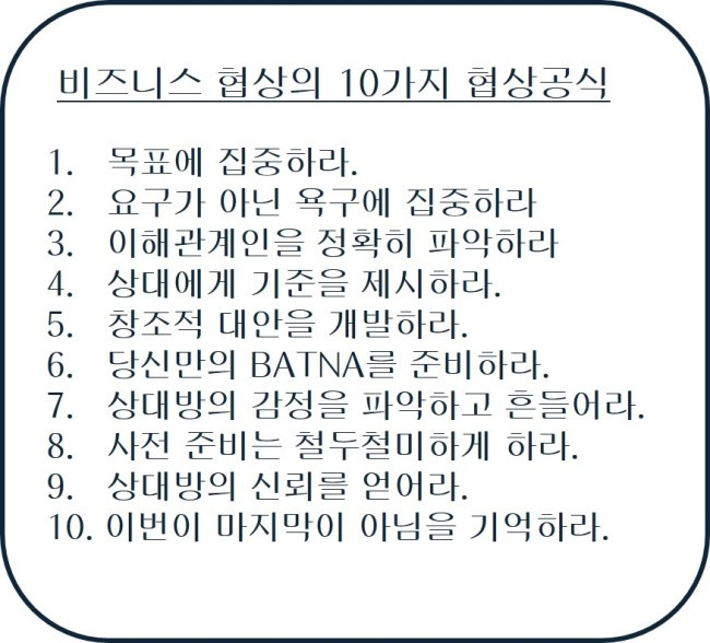 제 협상강연에서 언급되는 협상 기본공식 10가지는 아래와 같습니다.