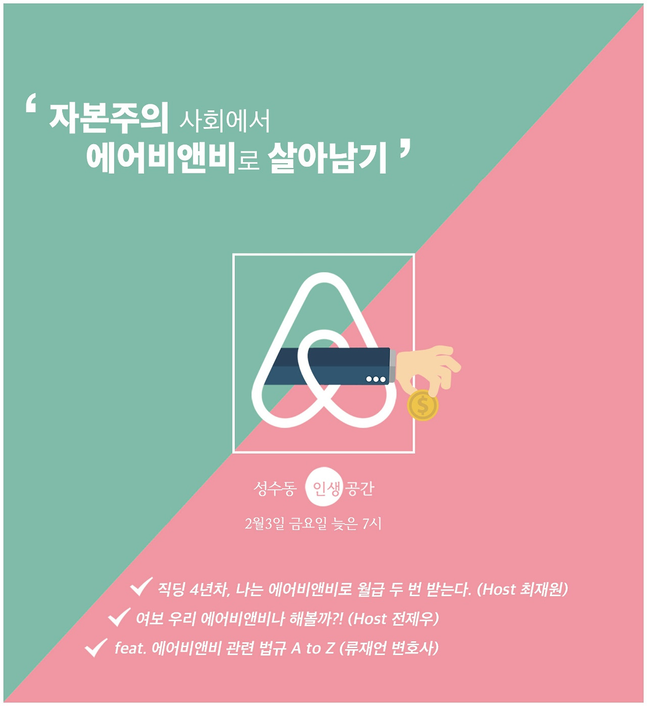 아름다운 사람들을 위한 코워킹스페이스 '성수동 인생공간'의 주인장이자 법률사무소 율본의 류재언변호사는 에어비앤비 관련 사건 자문 경험을 토대로 대한민국에서 에어비앤비를 운영하기 위해 꼭 필요한 관계법규를 디테일하게 설명하는 시간을 가지려고 한다.