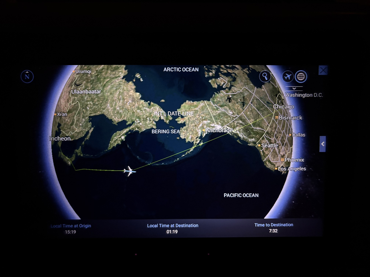 베링해 남쪽 항로를 지나갈 때엔 기체 흔들림이 너무 심해서 무서웠다. 엉덩이 공중부양도 5번은 한 거 같음;;; 약 1시간은 눈을 감고 기도하는 데 보냈다. 12시간 비행 내내 거의 한숨도 못 잤다.