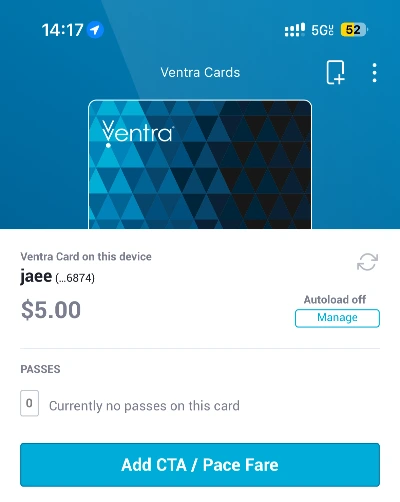 바로 다시 검색해서 시카고의 교통카드 Ventra를 다운받아 회원가입하고 금액을 충전하고 애플페이에 넣었다. 다음부터는 정상적으로 카드를 사용할 수 있었다.