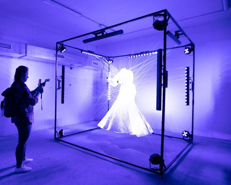 원형 LED 바를 지나는 순간 모션 트래킹 카메라가 사진을 촬영. 카메라 앞에 머무는 시간 동안 캡처된 사진의 길이가 늘어나며 실시간으로 사운드와 함께 스크린에 매핑됩니다.