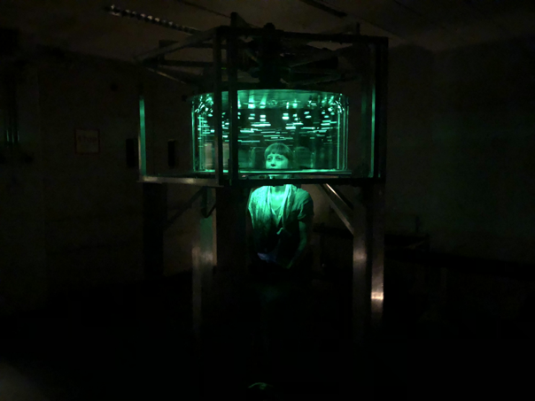 밖에서는 투명한 유리처럼, 안에서는 거울 같은 설치물에 들어가면 체험자의 모습이 연속의 조각으로 나눠져 보입니다. 작품이 회전하면서 그림이 여러 장 연속되어 보이는 애니메이션처럼