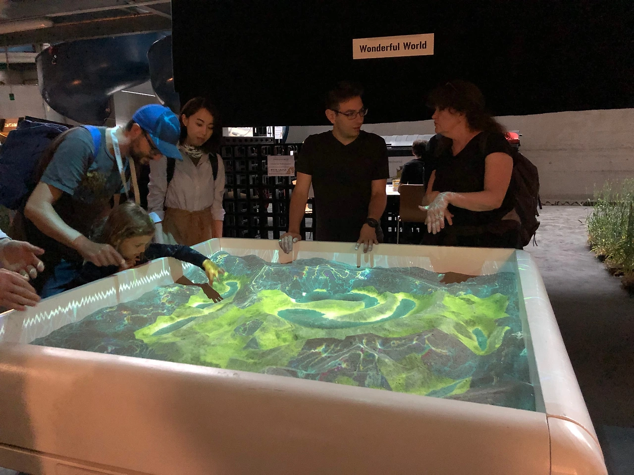 사용자가 테이블 안의 모래로 모양을 만지면 실시간으로 등고선이 매핑됩니다. 단순하고 직관적인 콘텐츠로 교육에도 활용되기 좋아 보였습니다.