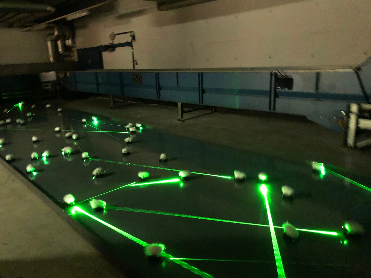반딧불이에서 영감을 받은 60개의 작은 로봇 무리들이 레이저를 내뿜습니다. 각각의 로봇은 빛 감지기를 통해서 비주얼 네트워크를 형성하게 되며 서로 부딪힘을 피해서 움직입니다.