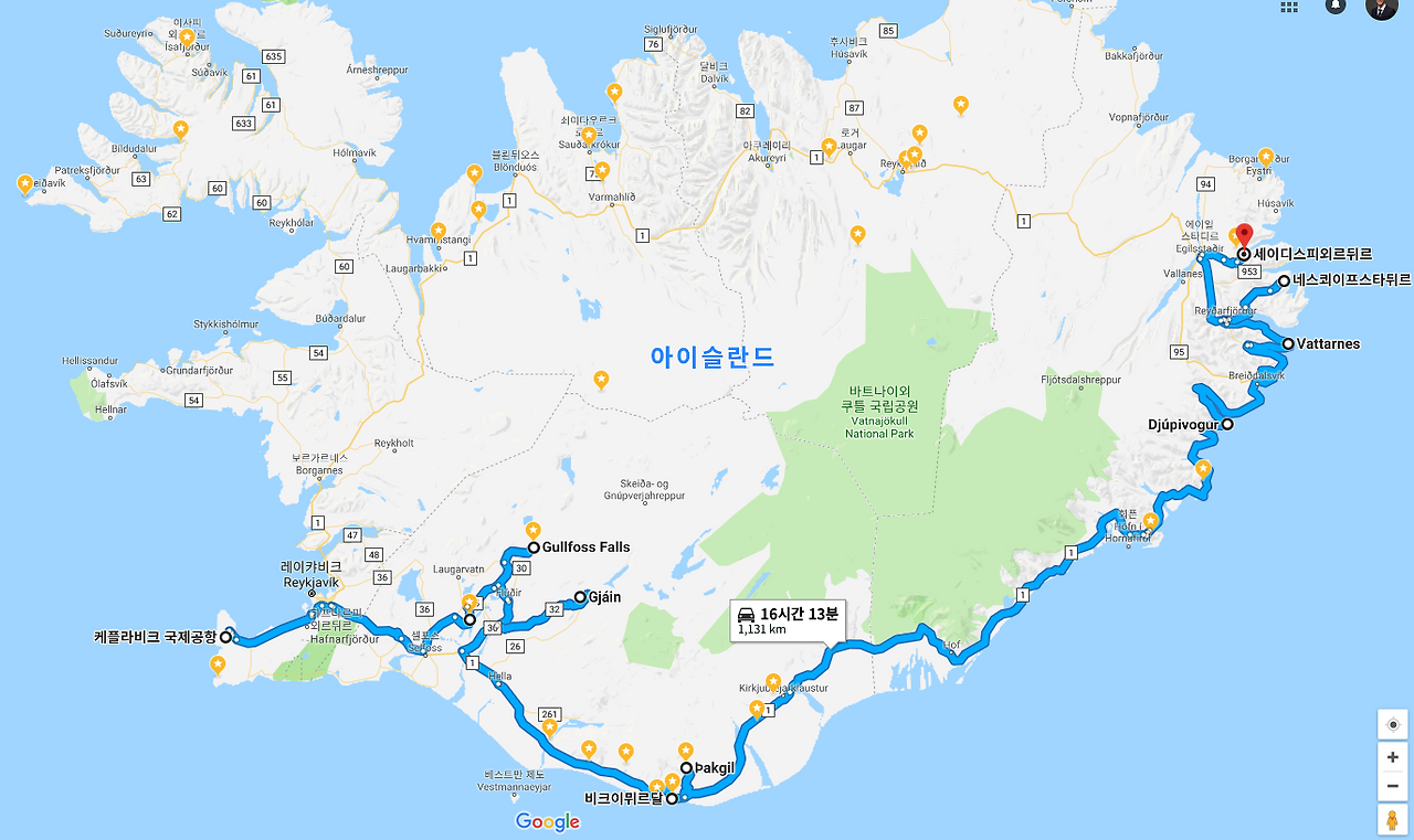 이 정도라면 동부 세이디스피외르디르 까지 여행하고 수도인 레이캬비크로 되돌아가는 일정이 맞습니다.